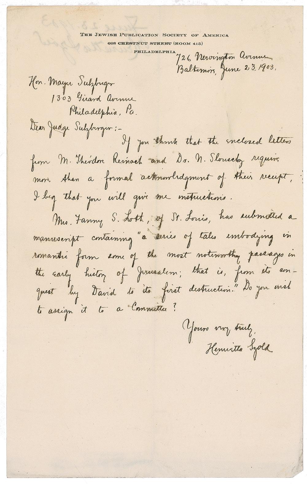 ALS signed “Henrietta Szold,” one page, 6 x 9.5, June 23, 1903, The Jewish Publication Society of America letterhead. Szold writes to Judge Mayer Sulzberger about correspondence she has received, including a manuscript “containing ‘a series of tales embodying in romantic form some of the most noteworthy passages in the early history of Jerusalem; that is, from its conquest by David to its first destruction.’ Do you wish to assign it to a Committee?” In fine condition, with intersecting folds, scattered creasing and docketing on the reverse lightly showing through.