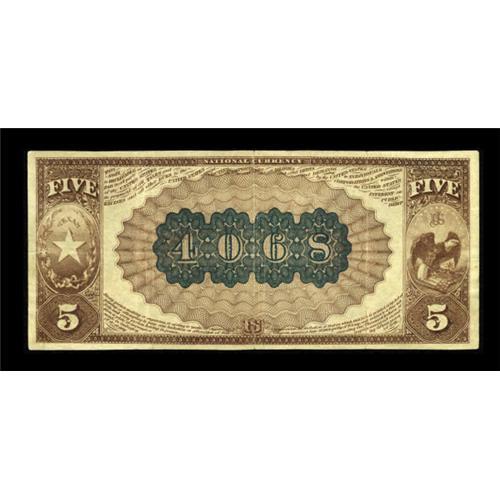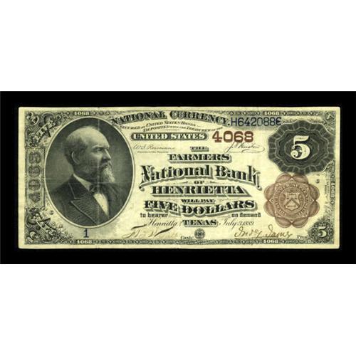 <B>Henrietta, TX</B></I> - $5 1882 Brown Back Fr. 471 <B>The Farmers NB</B></I> Ch. # 4068<BR> This note represents a true miracle of survival, as it comes from a bank in a tiny north Texas community which issued Brown Backs only before entering receivership in 1903. By 1915, a meager $505 was still outstanding from here. Two notes are known from the bank, both serial number 1 $5 Brown Backs, fortuitously saved for this generation's collectors by some unknown individual nearly 130 years ago. The other number 1 note is locked up in a long term Texas holding, leaving only this example to satisfy collectors seeking to own a note from Henrietta. When last offered, this attractive pen signed <B>Very Fine</B></I> specimen realized only $16,100 in a market where Texas collectors at this level were few and far between. Now, in a more sophisticated market that realizes the true rarity of real trophy items, we expect a considerably higher figure to be achieved before the hammer falls on this great item tonight. <BR><BR><b>Shipping:</b> Coins & Currency (<a target="_blank" href="http://www.heritageauctions.com/common/shipping.php">view shipping information</a>)