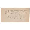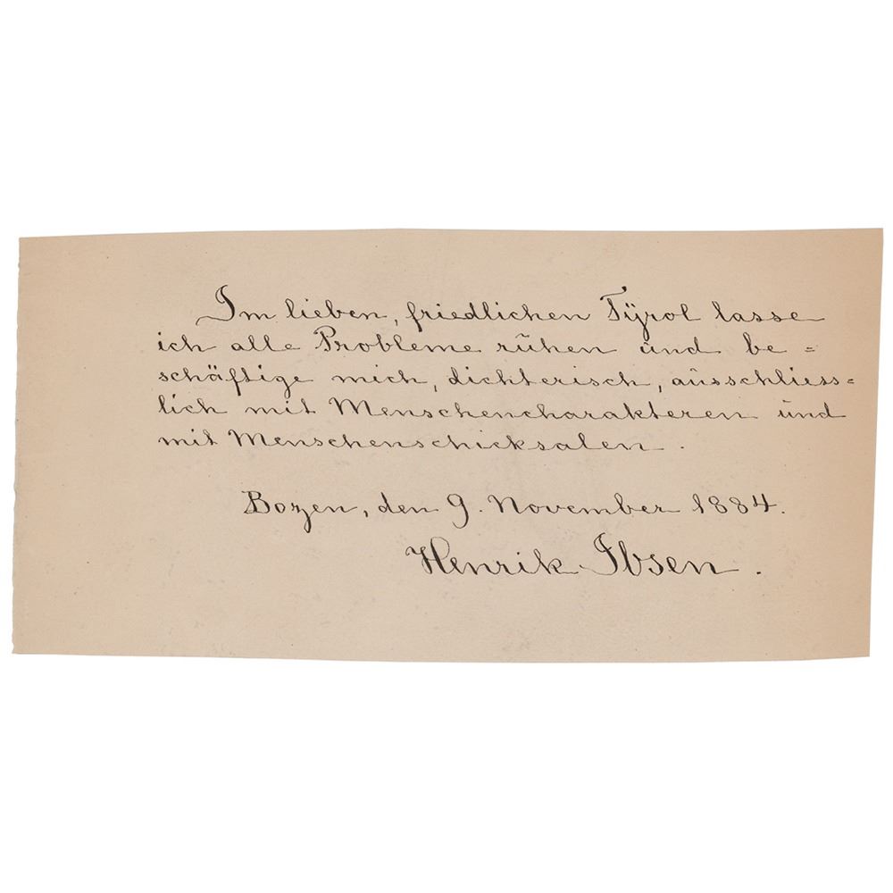 AQS in German on an off-white 7.5 x 3.75 sheet, dated at Bolzano, Italy, November 9, 1884. Handwritten quotation by Ibsen, in full (translated): "I let all my problems rest in dear peaceful Tyrol and occupy myself poetically exclusively with human character and with human fate. Bozen, 9 November 1884, Henrik Ibsen." In fine condition.