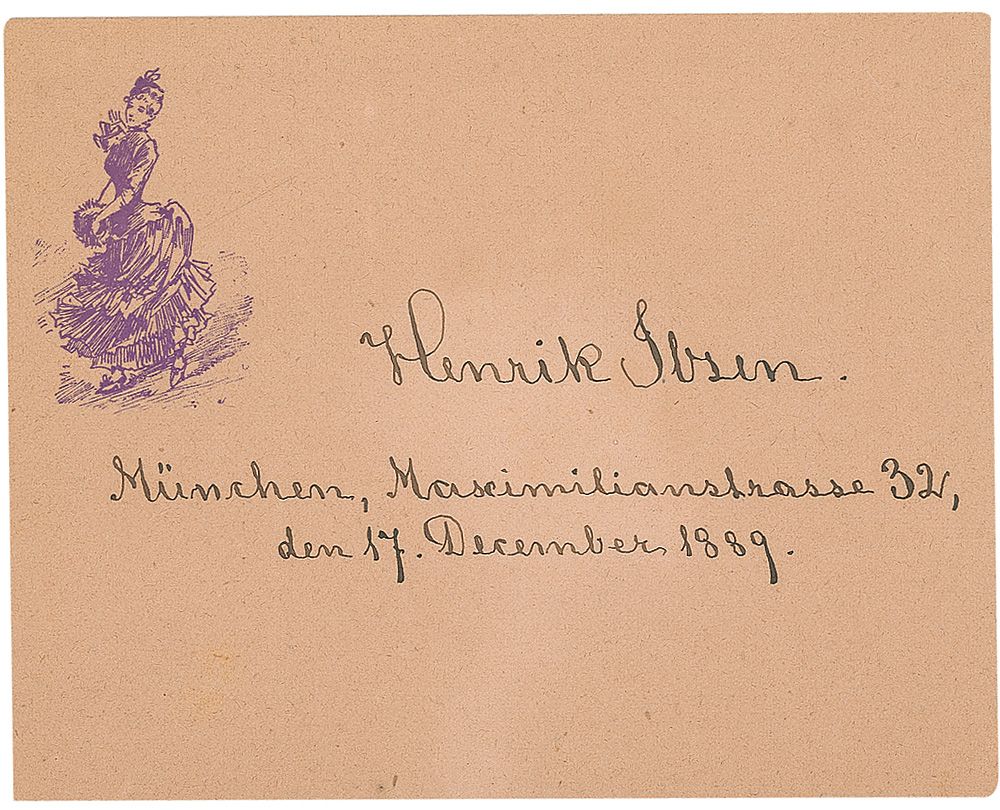 Vintage ink signature, “Henrik Ibsen, Munchen, Maximilianstrasse 32, den. 17 December 1889,” on an off-white 4.5 x 3.5 stationery card with an image of a woman in the upper left. In fine condition, with a uniform shade of toning and mounting remnants to the reverse.