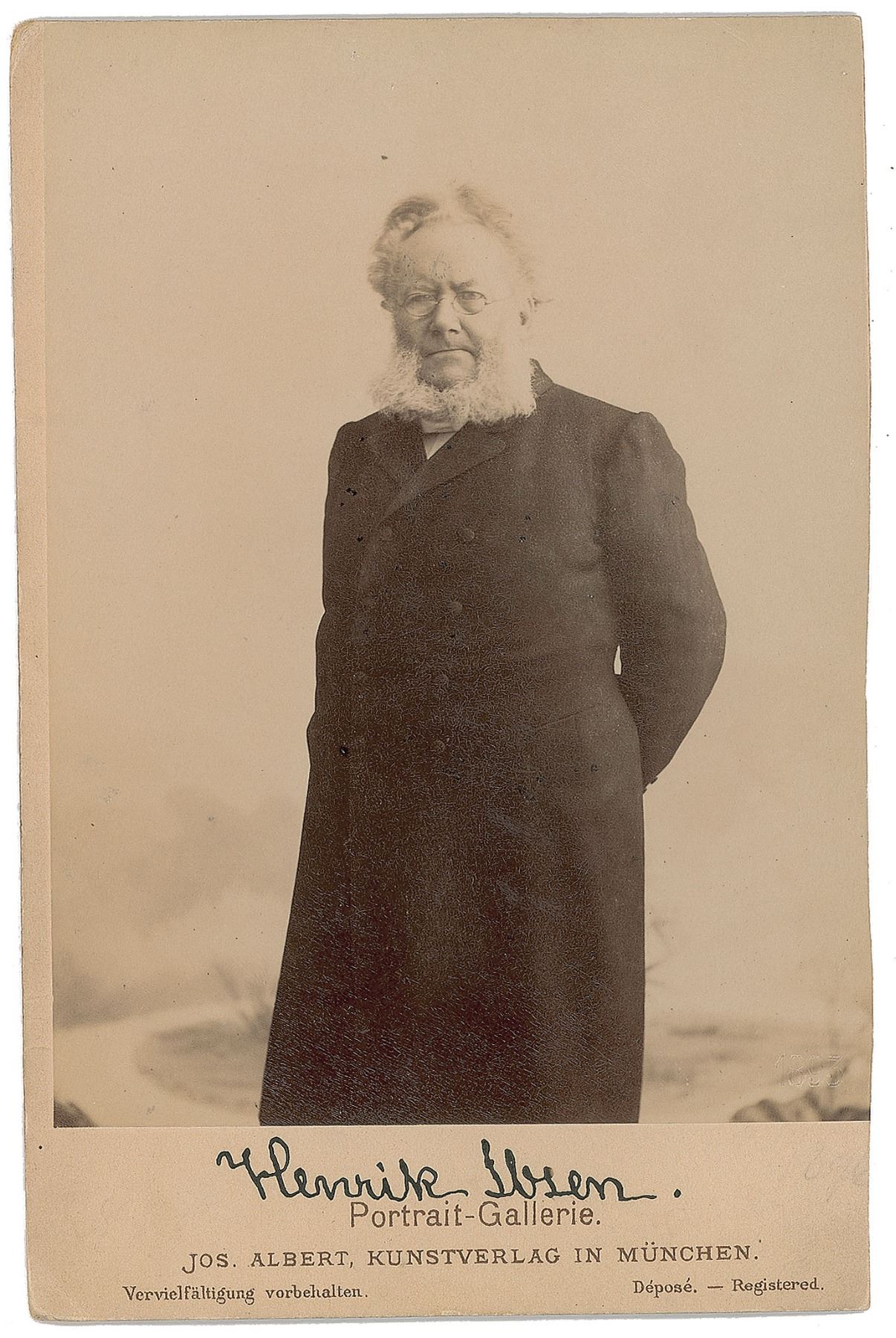 Revered Norwegian playwright and poet (1828–1906) whose works, including A Doll's House and Hedda Gabler, made him one of the seminal figures of modern drama. Wonderful 4.25 x 6.5 cabinet photo of Ibsen in a long black coat, boldly signed on the mount in ink, "Henrik Ibsen." Published by Jos. Albert of Munich. In fine condition, with trimmed top and right edges.
