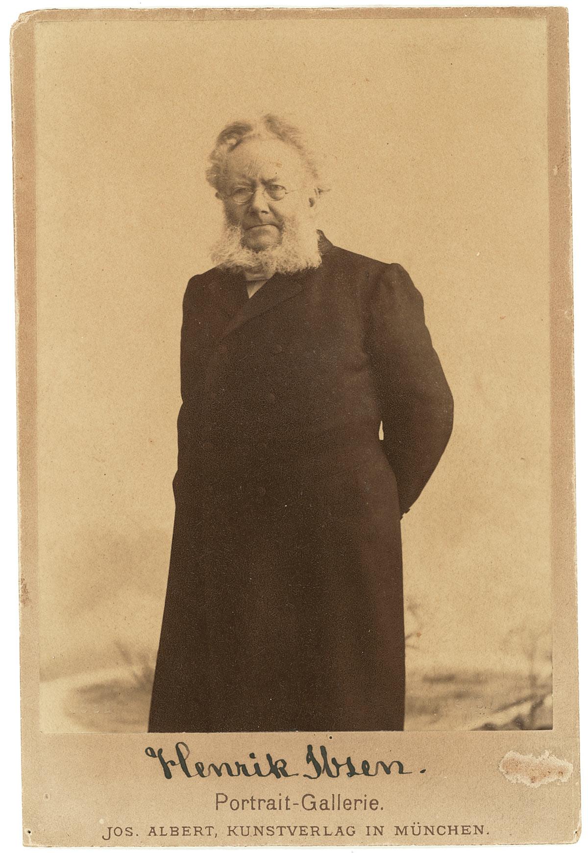 Original vintage 4.25 x 6.5 three-quarter length cabinet Joseph Albert photo of the spectacled and heavily whiskered playwright sternly eyeing the camera signed in the lower border in fountain pen. In fine condition, with a small tack hole to lower left corner, slight chipping and corner rounding to top left, and a small spot of discoloration to lower right under image. All autograph material of Ibsen is avidly sought, and signed images are particularly scarce. Pre-certified John Reznikoff/PSA/DNA and RRAuction COA.