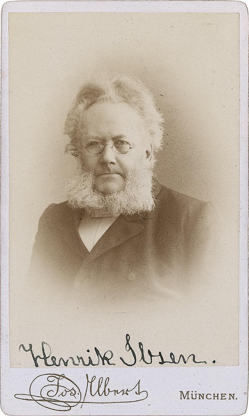 Revered Norwegian playwright and poet (1828–1906) whose works, including A Doll’s House and Hedda Gabler, made him one of the seminal figures in the forefront of modern drama. Scarce original vintage 2.5 x 4 carte-de-visite photo of the spectacled and heavily whiskered playwright sternly eyeing the camera, by Joseph Albert Studios in Munich, signed along the bottom of the image in black ink. In fine condition, with image having been very carefully removed from its original card mount with no ill effect whatsoever. All autograph material of Ibsen is avidly sought, and signed images are particularly scarce.