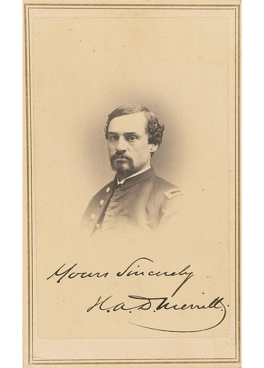 Union cavalry officer from New York. Original 2.25 x 4 carte-de-visite photo by Bogardus of New York, signed below the image in black ink, “Yours sincerely, H. A. D. Merritt.” In fine condition, with a few trivial marks near top edge.