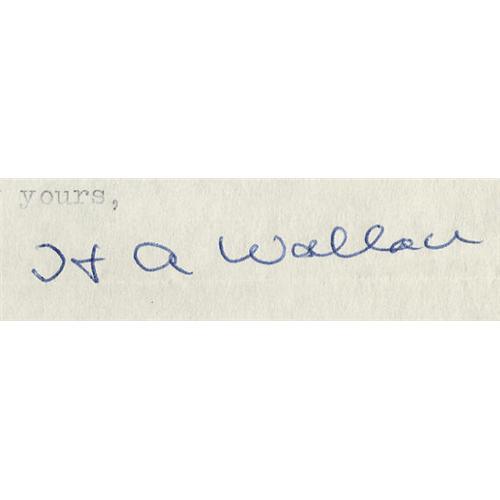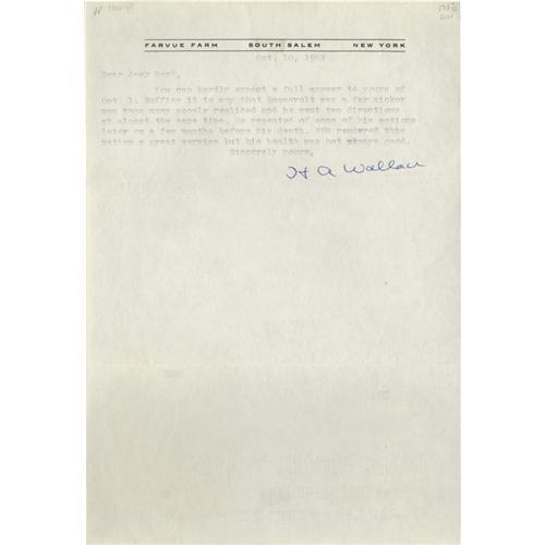 <B> Henry A. Wallace Typed Letter Signed </B></I> "<I>H A Wallace.</B></I>" One page letter, measures 7.2" x 10.5"; signed in blue ink, dated October 10, 1962, from South Salem, New York. This letter is written to a Mr. Jack Mark and reads in part, "<I>Suffice it to say that Roosevelt was a far sicker man than many people realized and he went two directions at almost the same time. He repented of some of his actions later on a few months before his death. FDR rendered this nation a great service but his health was not always good.</B></I>" Wonderful content regarding Franklin D. Roosevelt, one of America's most beloved presidents. <BR><BR> The letter is in very fine condition; usual folds are present; small stain in the header of the stationery; small pencil notation on upper right corner.