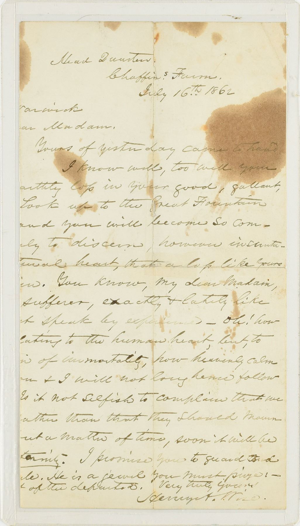 American statesman and diplomat (1806-1876) who served as a brigadier general in the Confederate army, where he fought beside Lee at Appomattox Court House. His most notable act as governor of Virginia was to sign the death warrant of famed abolitionist John Brown. Partial Civil War-dated ALS, one page, 5.25 x 9.75, July 16, 1862. A letter of condolences written from "Head Quarters" at Chaffin's Farm in Henrico County, Virginia, in part: "Yours of yesterday came to hand. I know well, too well your…[e]arthly loss in your good, gallant,…Look up to the Great Fountain…and you will become so com—…You know, my dear Madam…sufferer, exactly & lately like…speak by experience—oh! how…to the human heart, to…of immortality, how heavenly calm…& I will not long hence follow. Is it not selfish to complain that we…than that they should mourn…[b]ut a matter of time, soon it will be…I promise you to guard and…He is a jewel you must prize:—…of the departed." Encapsulated in a Mylar sleeve. In very good condition, with trimmed left edge affecting text, repaired intersecting folds, and stains affecting appearance but not readability.