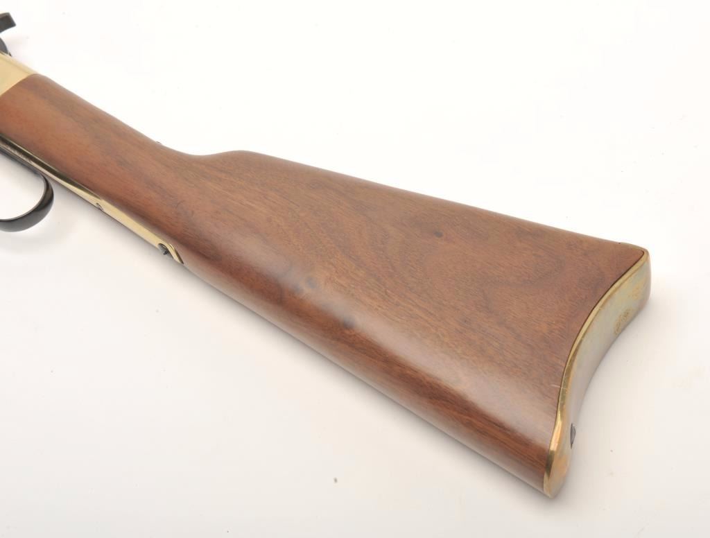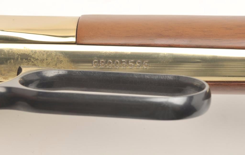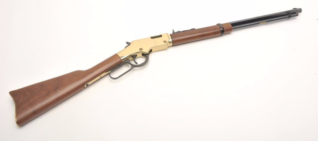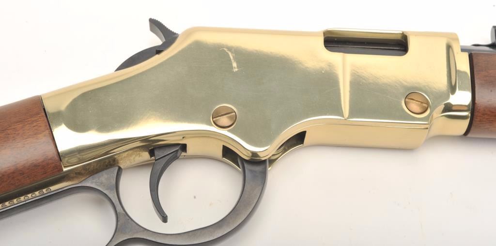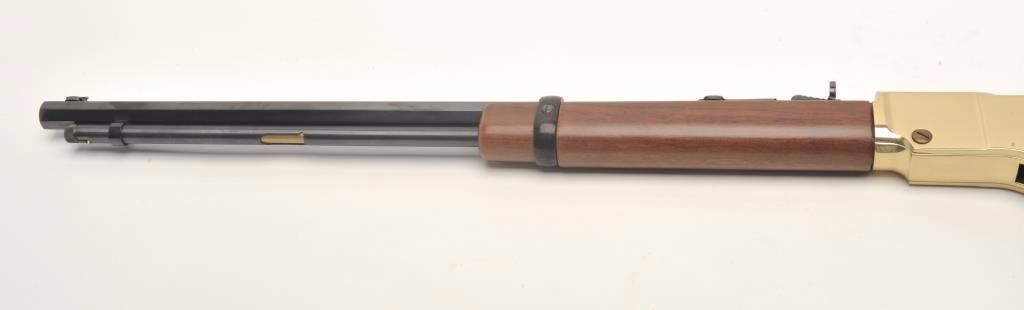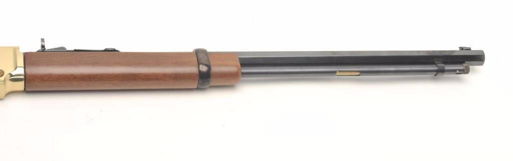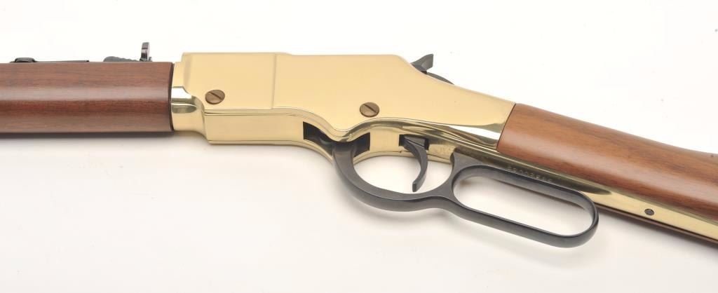 Henry Arms Golden Boy lever action rifle, .22 L.R. caliber, serial #GB003596. The rifle is in very good overall condition with a 20” octagon barrel and full-length magazine. The barrel and magazine retain nearly all oftheir polished blue finish. The receiver is high polish brass with only light handling marks. The smooth wood stocks are in very good condition with light storage marks. The butt stock ends with a smooth, brasscrescent butt plate. The bore is very good, the action crisp and markings are sharp on this lightly used Henry. (Modern) Est.: $300-$600.