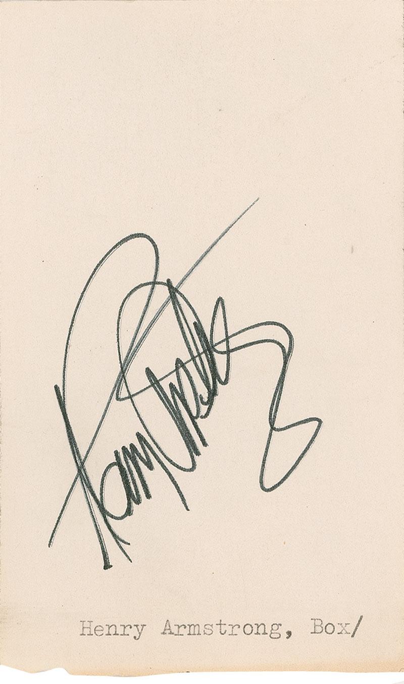 Boxer (1912–1988) who simultaneously held the featherweight, welterweight, and lightweight championships in 1938. Felt tip signature, “Henry Armstrong,” on an off-white 5 x 3 card, with typed collector’s notations along bottom. Some light edge toning, and a bit of paper loss along bottom edge, otherwise fine condition.