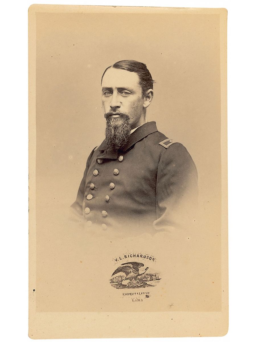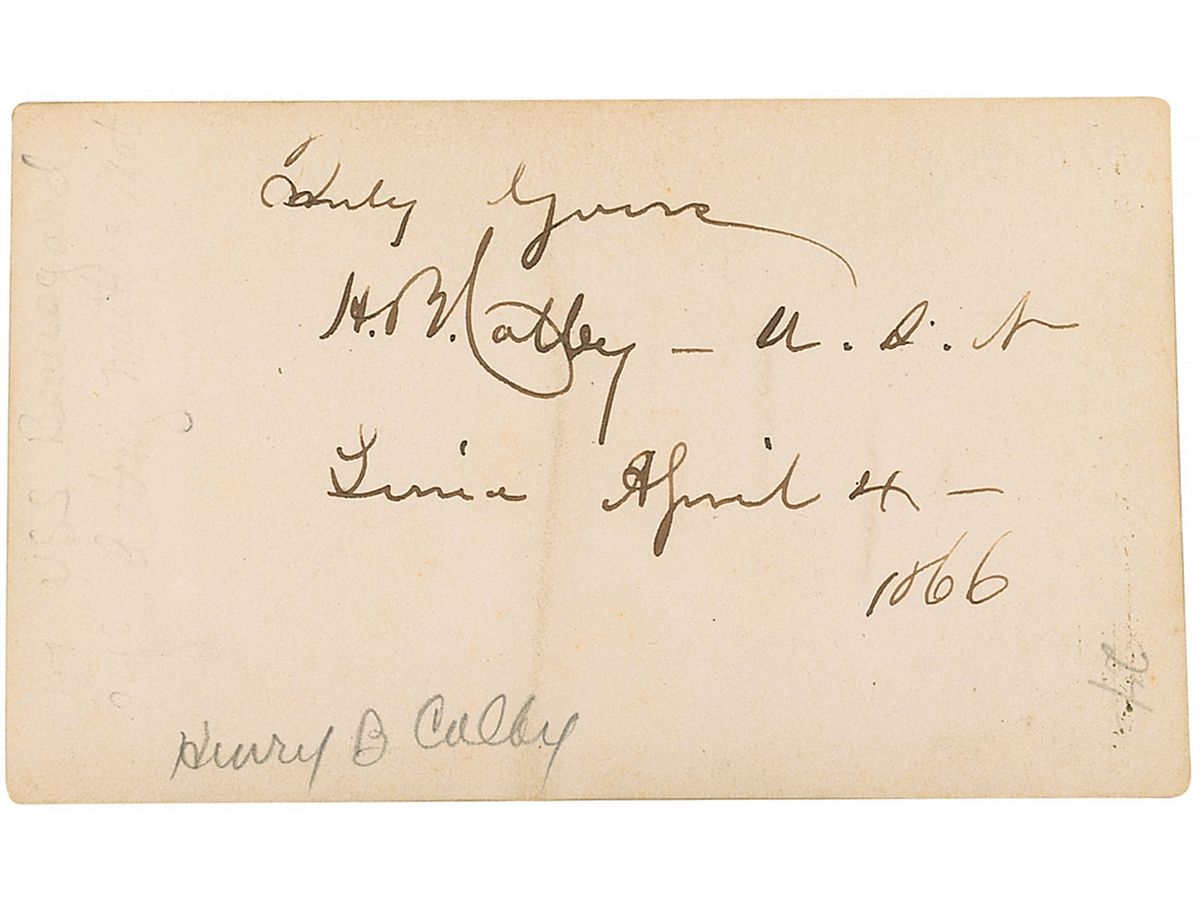 Union naval officer who served as acting master’s mate on board the USS Beauregard. Original 2.25 x 4 carte-de-visite photo by Richardson of Lima, signed horizontally on the reverse in black ink, “Truly yours, H. B. Colby—U.S.N., Lima, April 4—1866.” Some light bends and ripples, a few surface dings, and some mild toning and pencil notations on reverse, otherwise fine condition.