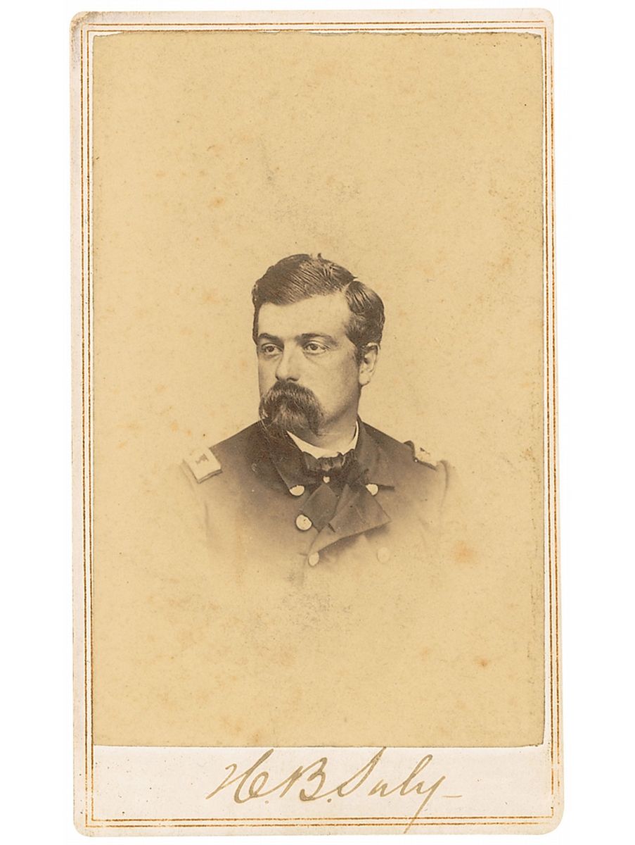 Union naval officer (1838–1901) who served on the steamer Sumter, part of the South Atlantic blockading squadron. Original 2.25 x 4 carte-de-visite photo by Bradley and Rulofson of San Francisco, signed in the lower border in black ink, “H. B. Seely.” In fine condition, with some scattered light soiling and spotting to background of image and a two-cent revenue stamp affixed to reverse.