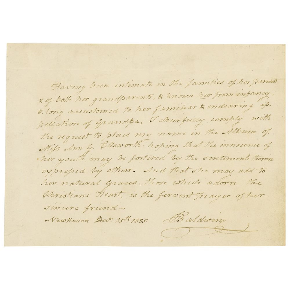 Autograph dedication statement signed “H. Baldwin,†one page, 7.25 x 5.25, New Haven, December 15, 1835. A handwritten statement for an album presented to Ann G. Ellsworth, in full: “Having been intimate in the families of her parents & of both her grandparents, & known her from infancy, & long accustomed to her familiar & endearing appellation of Grandpa, I cheerfully comply with the request to place my name in the Album of Miss Ann G. Ellsworth, hoping that the innocence of her youth may be fostered by the sentiments therein expressed by others. And that she may add to her natural graces those which adorn the Christians Heart, is the fervent prayer of her sincere friend.†In fine condition.