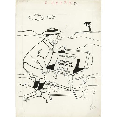 <B>Henry Boltinoff - Humorama Panel Cartoon (undated).</B></I> Financial advertising -- it's everywhere! Crisp, stylized lines and surreal, offbeat humor were the keystones of Henry Boltinoff's style, and this 9" x 12" panel is sure to make you smile! This art is in Excellent condition.