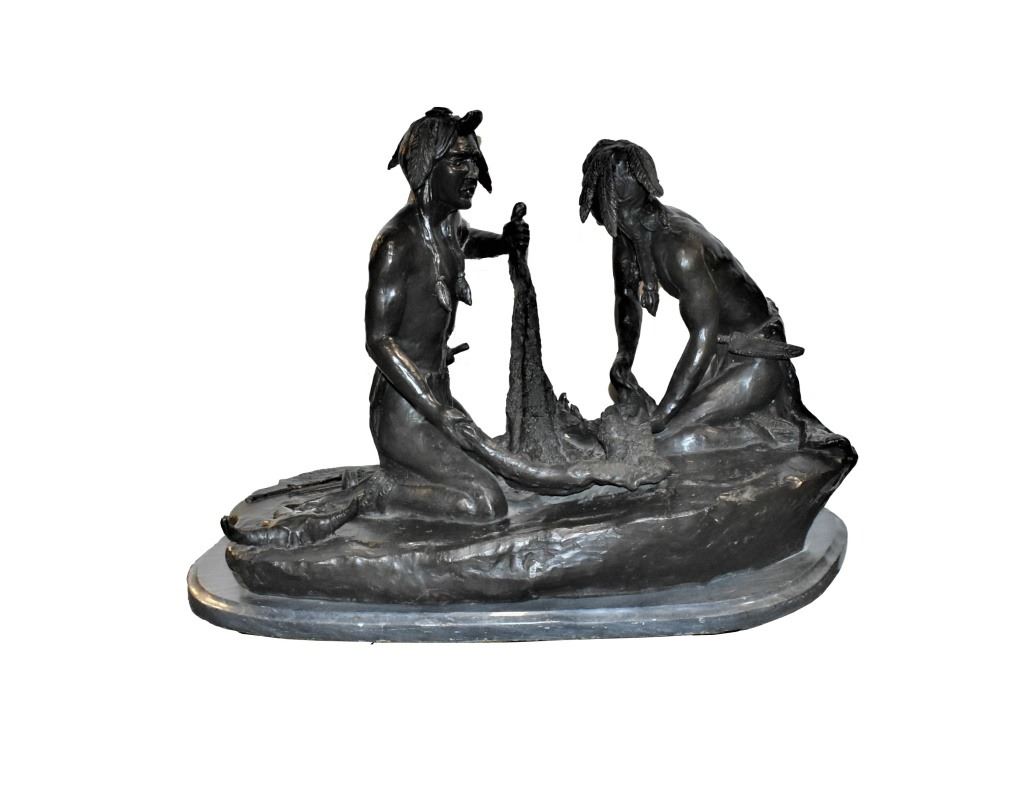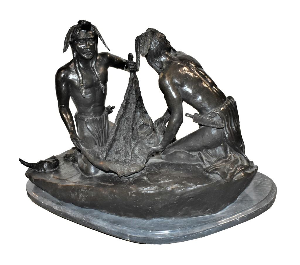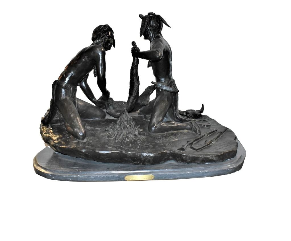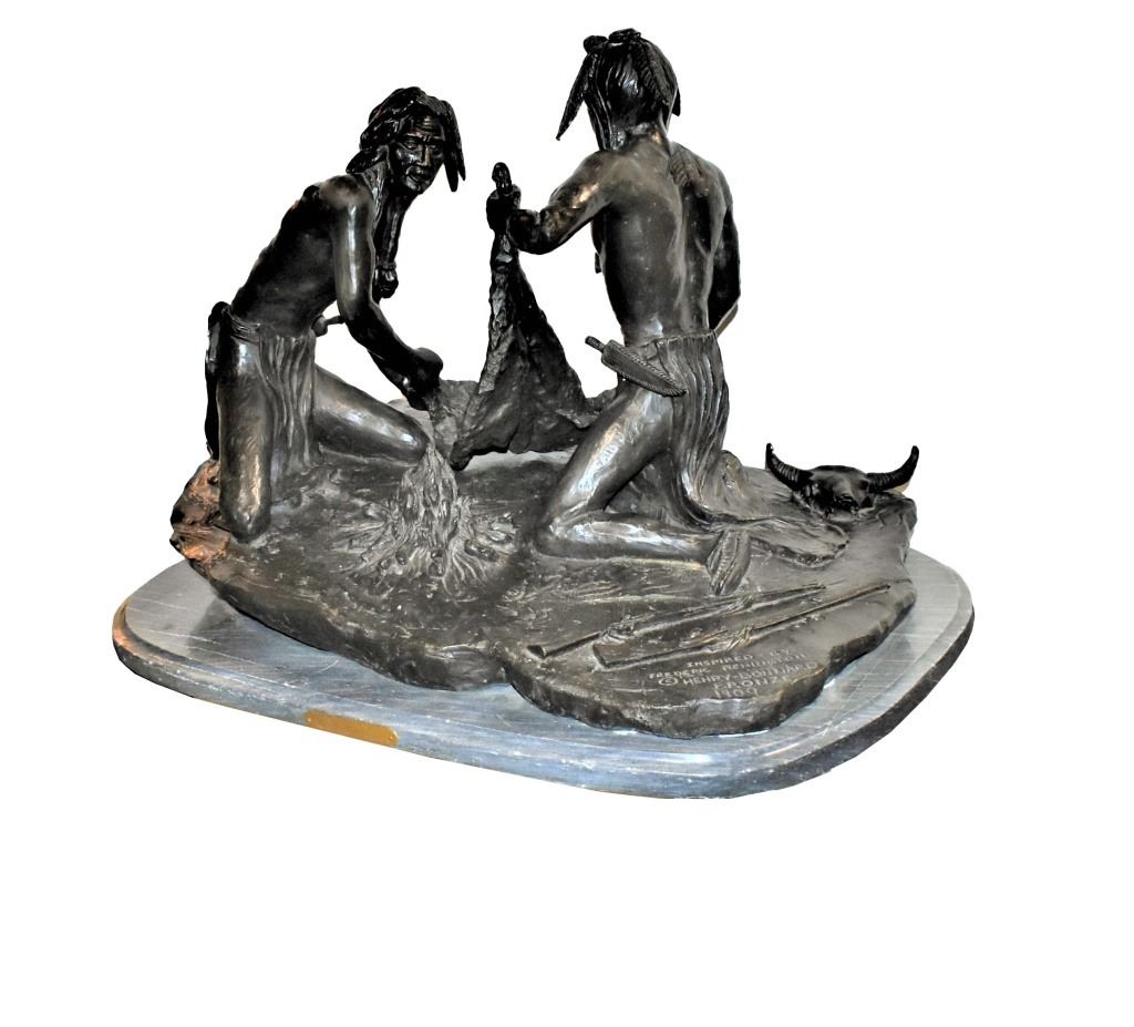 Henry Bonnard Bronze Western Americana Remington Inspired Sculpture "Smoke Signal". Inspired by Frederick Remington's work in 1909, this bronze depicts two Indian Braves using buffalo hide to send smoke signals. 29 X 20 X 19 inches.