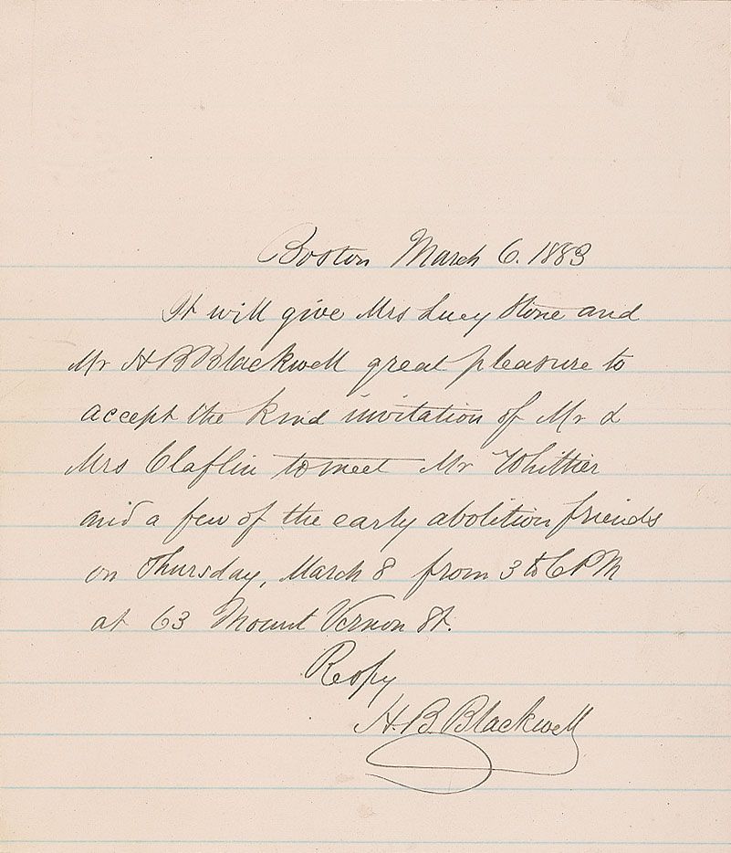 American advocate for social and economic reform (1825–1909), and husband of Lucy Stone, with whom he helped found the American Woman Suffrage Association. ALS signed “H. B. Blackwell,” one page, lightly-lined, 5 x 5.25, March 6, 1883. Response to an invitation. In part: “It will give Mrs. Lucy Stone and Mr. H. B. Blackwell great pleasure to accept the kind invitation…to meet Mr. Whittier and a few of the early abolition friends on Thursday.” Affixed to a slightly larger sheet. In fine condition.