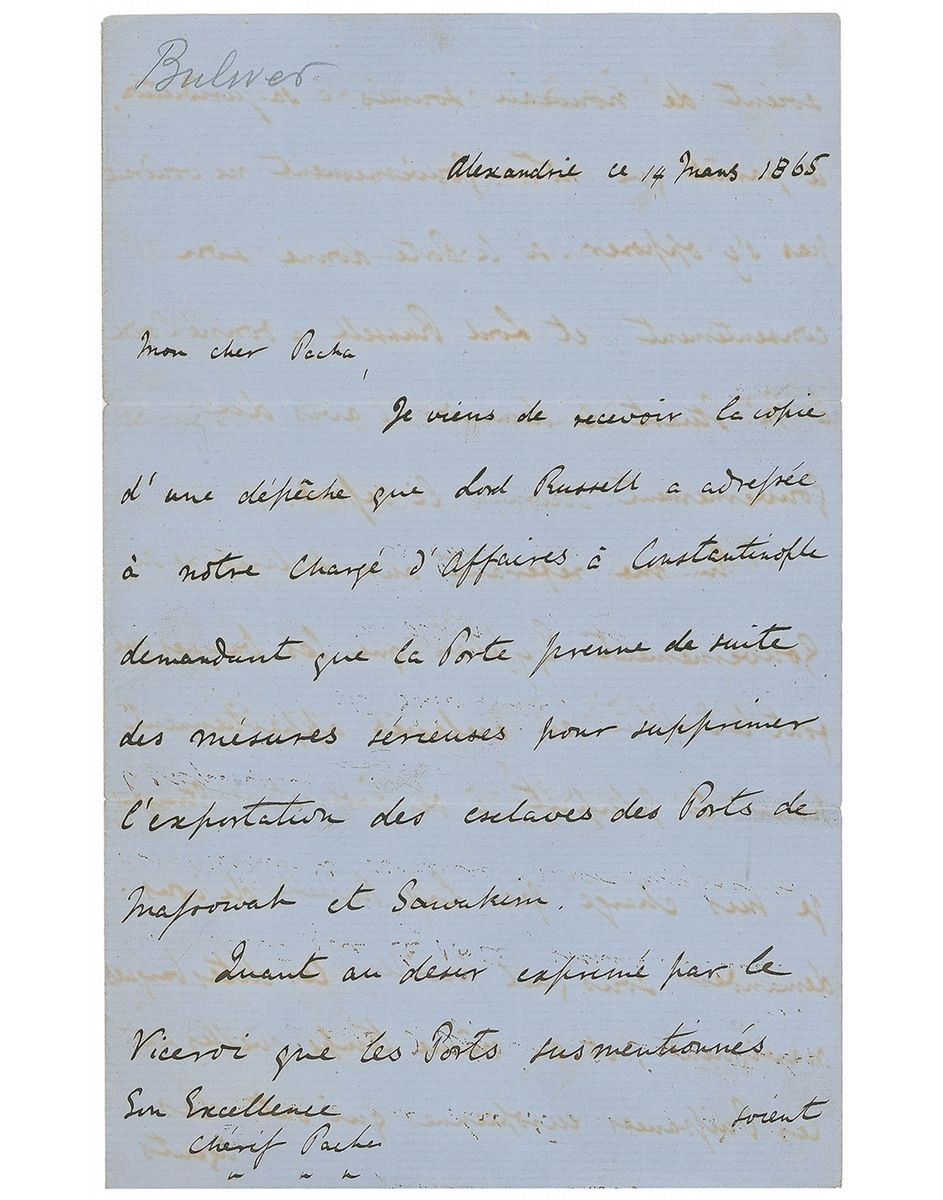 British Liberal politician, diplomat, and writer (1801–1872). Untranslated ALS in French, four pages on two adjoining sheets, 5.25 x 8.5, March 14, 1865. Some light mirroring to ink and show-through from writing to opposing sides, and a tape repair to a small edge separation at one mailing fold, otherwise fine condition.
