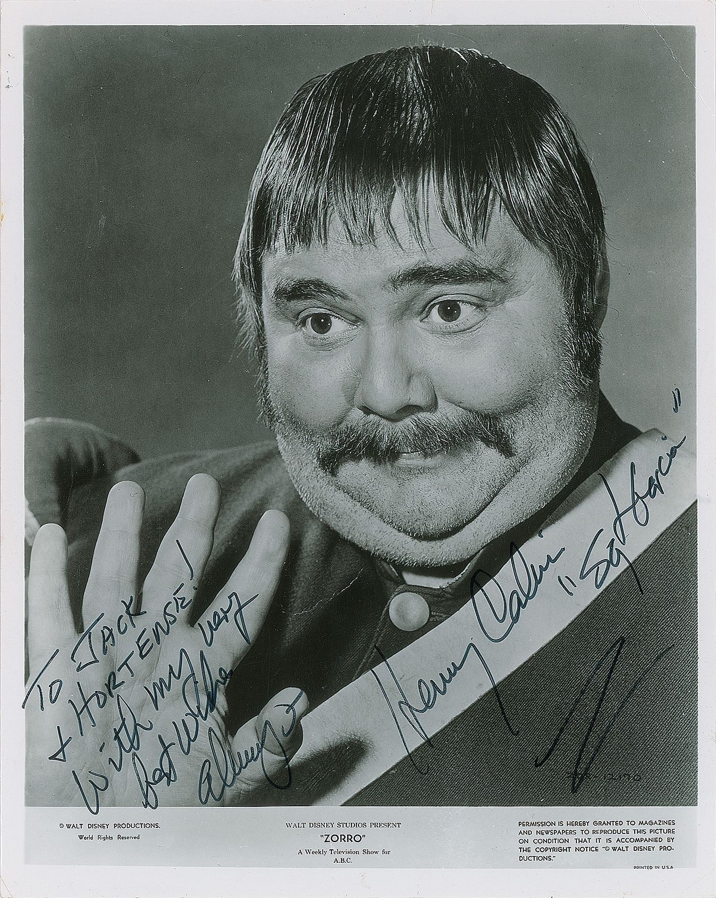 American comic actor (1918–1975) best known for his role as Sergeant Garcia on the 1950s TV series Zorro. Vintage glossy 8 x 10 publicity photo of Calvin as he appeared in Zorro, signed and inscribed in black felt tip, "To Jack & Hortense! With my very best wishes always, Henry Calvin, 'Sgt. Garcia.'” In very good to fine condition, with a few moderate creases.