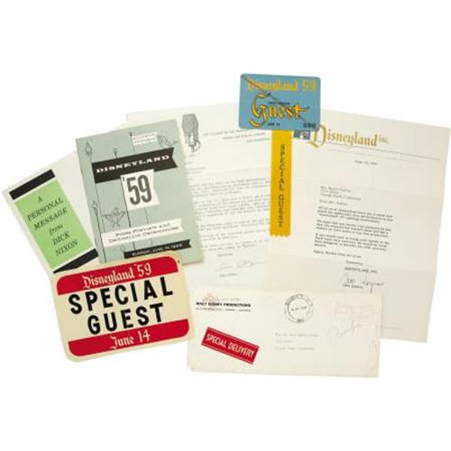<B>Henry Calvin's Disneyland Pass, Program and Papers.</B></I> Henry Calvin had become a major hit as Sgt. Demetrio Lopez Garcia on Walt Disney's <I>Zorro</B></I> TV series, and was invited to the Disneyland June 14, 1959 Press Preview and Dedication Ceremonies, which introduced the Submarine Voyage and the Monorail. Included in this lot are Calvin's "Special Guest" badge, his souvenir program (noting the presence of Vice President Nixon, who, with his family, dedicated the monorail train that day), a Special Guest parking sticker, and a letter (on Disneyland Inc. stationery) from Jack Sayers thanking Calvin for attending (it comes with its original "Special Delivery" envelope with Mickey Mouse pictured in the return address logo). Also included: a mailer from Nixon regarding the June 7, 1960 primary election (with a picture of the Vice President with wife Pat and daughters Patricia and Julie) that Calvin later placed inside his program; and a letter from Sean O'Hara of KCSF Radio in San Francisco, dated September 30, 1959 and thanking Calvin for an interview. All items in Very Good condition. Interesting items from a Disney insider.<BR><BR><b>Shipping:</b> Flat Material, Small (<a target="_blank" href="http://www.heritageauctions.com/common/shipping.php">view shipping information</a>)