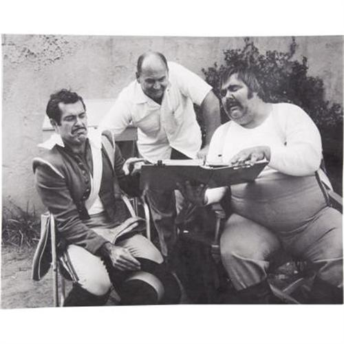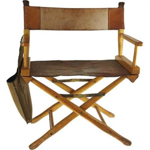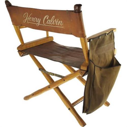 <B>Henry Calvin's Personal Chair from the Set of "Zorro".</B></I> A leather and wood director's chair, 36" in height, used by actor Henry Calvin on the set of the 1957-59 <I>Zorro</B></I> TV series. Calvin's name is printed on the leather back rest, and the chair also features a 13" x 21" canvas pouch attached to the right side for storing scripts and other items. In Very Fine condition with some wear from age and use.<BR><BR><b>Shipping:</b> Miscellaneous Collectibles, Larg (<a target="_blank" href="http://www.heritageauctions.com/common/shipping.php">view shipping information</a>)