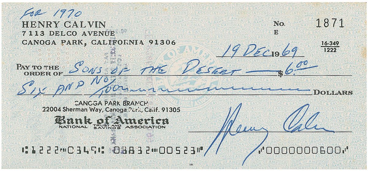 American comic actor (1918–1975) best known for his role as Sergeant Garcia on the 1950s TV series Zorro. Personal check, 6 x 2.75, filled out and signed by Calvin, payable to the famous organization celebrating Laurel and Hardy, Sons of the Desert for $6.00, December 19, 1969. In fine condition, with a central vertical fold, cancellation holes to left side, and a couple of trivial spots. A neat connection as Calvin played Oliver Hardy in a memorable Laurel and Hardy sketch on The Dick Van Dyke Show.