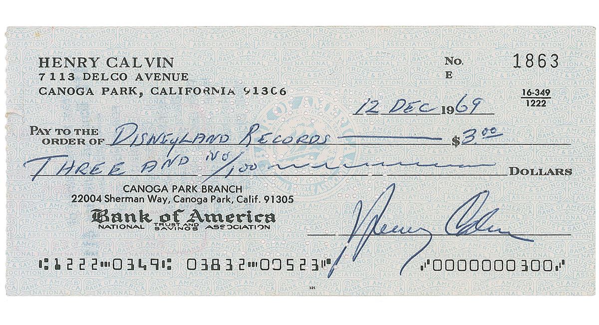 American comic actor (1918–1975) best known for his role as Sergeant Garcia on the 1950s TV series Zorro. Personal check, 6 x 2.75, filled out and signed by Calvin, payable to Disneyland Records for $3, December 12, 1969. In fine condition, with two vertical folds, a small tear and staple holes to left edge, and expected bank stamps and cancellation holes (trivially affecting first letter of the signature).