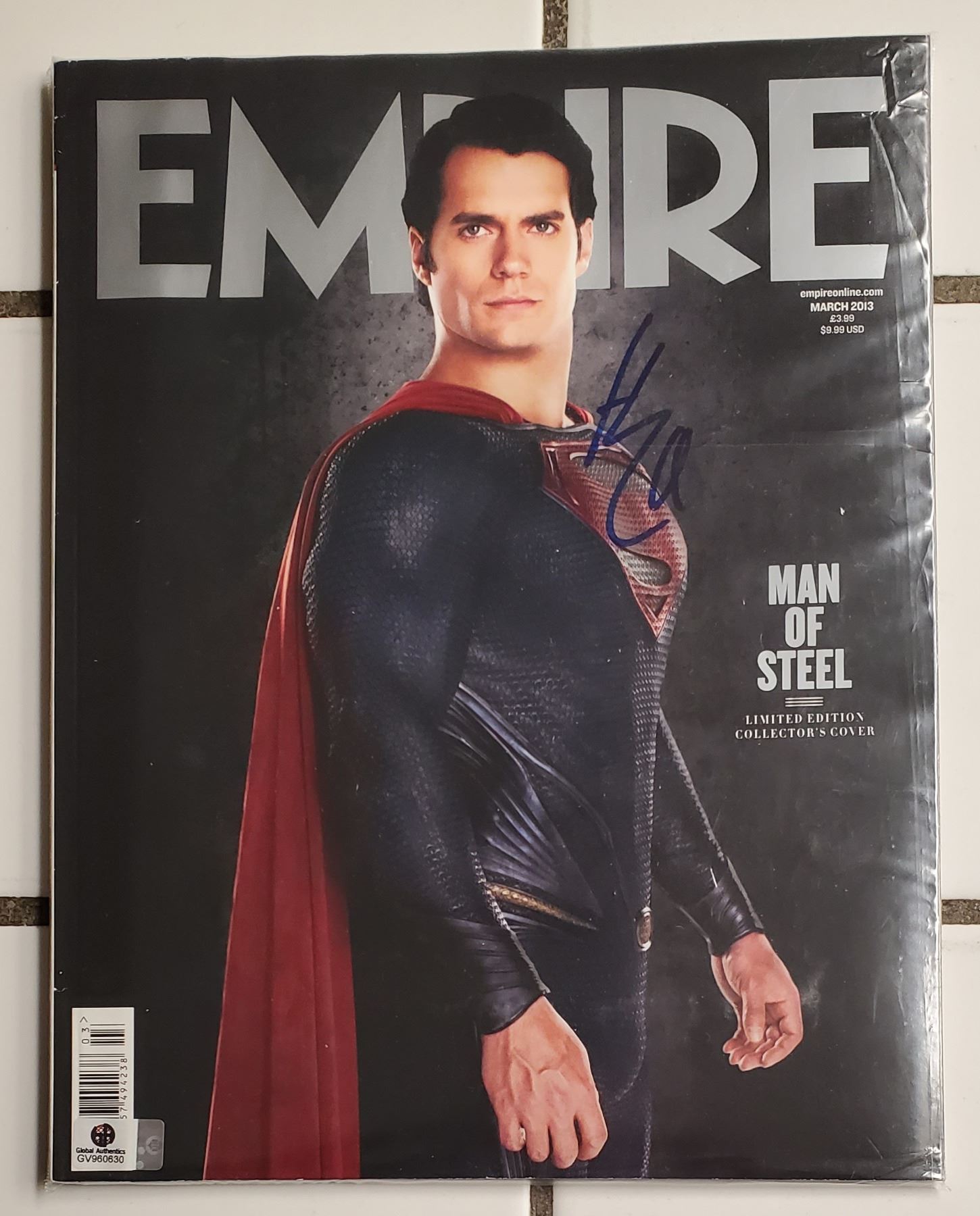 A March 2013 issue of Empire magazine signed by Henry Cavill. The autograph is authenticated by Global Authentics who issued a COA numbered GV 960630. The magazine features a close-up of Superman (Henry Cavill).
