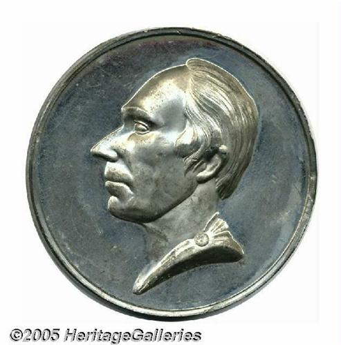 <B>Henry Clay 1844 Medal</B></I> A sizable medal with real heft! Sullivan 1844-2, 50 mm, white metal, this fat campaign medallion has a deeply incused depiction of factories belching out smoke and ships at high sea - commerce in the purest sense for the first half of the 19th century. Clay was "The People's Choice" as a nominee, having sought high office on three occasions. Minor, typical rim digs and scratches detract little. This is one of the best Clay tokens to be found. Lot:256