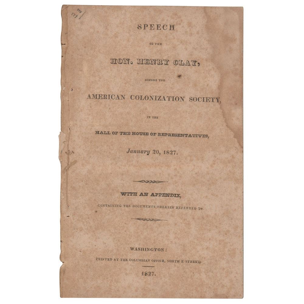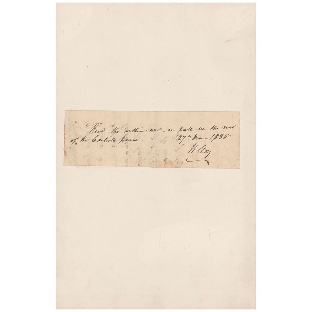 ADS signed "H. Clay," on a 5 x 1.75 slip, March 27, 1835. Handwritten financial receipt, in full: "Rec'd the within amt in full the rent of the Carlisle farm." Affixed to a larger page and in fine condition, with a small stain to the bottom. Accompanied by an unsigned original booklet of Clay's speech "before the American Colonization Society," on January 20, 1827, printed at the request of the Society.