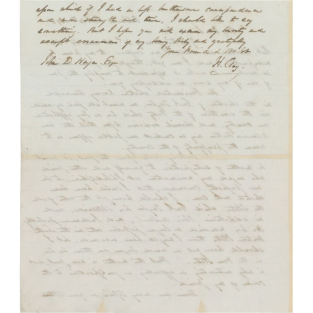 ALS signed "H. Clay," one page both sides, 9 x 10.5, December 10, 1848. Letter to friend and supporter John D. Hayes, in part: "The Presidential election having terminated in the election of Genl. Taylor, we must all feel rejoiced in the overthrow of the Party which has so long afflicted our country, and cherish anxious hopes that the new Administration may so conduct our public affairs as to assure the prosperity of the Country. In looking back upon the past, it must be a matter of satisfaction to yourself and other friends who urged my nomination at Philadelphia, to now be perfectly convinced, that I could have been elected with ease. I should have got the votes of all the States which Genl. Taylor obtained, and in addition, Ohio certainly, and Indiana probably. He has received a larger popular vote in the South Western States than I might have received, but I should have got a much larger one than he has in the new States. But this matter is now past, and is only interesting as affecting a justification to the course of my friends."