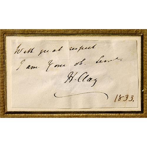 <Our item number 135709><B>Clay, Henry.</B> (1877-1852) Statesman and orator from Kentucky; known as the "Great Compromiser." Autograph sentiment signed ("H.Clay") as a senator, 1¼ x 2½ in., n.p., 1833. In full: "With great respect I am Your ob. Servt. H. Clay 1833." Matted with an oval portrait of Clay and framed to an overall size of 13 x 9½ in. Fine. <BR>Estimated Value $150 - 200. <BR><BR>Our item number 135709<BR><IMAGES><P ALIGN="CENTER"><IMG SRC="http://www.goldbergcoins.net/liveauction/49jpegs/135709.jpg"> <BR><IMG SRC="http://www.goldbergcoins.net/liveauction/49jpegs/135709N2.jpg"> <BR><IMG SRC="http://www.goldbergcoins.net/liveauction/49jpegs/135709N3.jpg"> </P></IMAGES>
