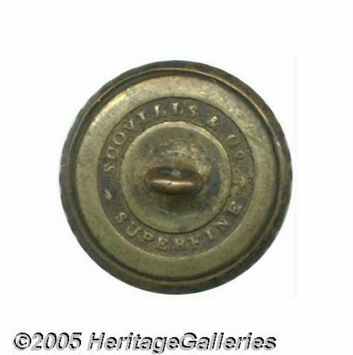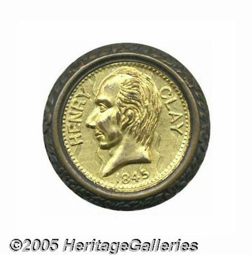<B>Henry Clay Clothing Button</B></I> Sullivan-DeWitt HC 1844-61, 22 mm. The center of this clothing button has a gilt brass insert featuring a bust of Clay on a wavy background, inscribed "Henry Clay 1845." The brass border has a raised floral design. This attractive campaign item from 1844 was produced by Scovill's of Waterbury, current makers of Hamilton Beach mixers. Lot:256