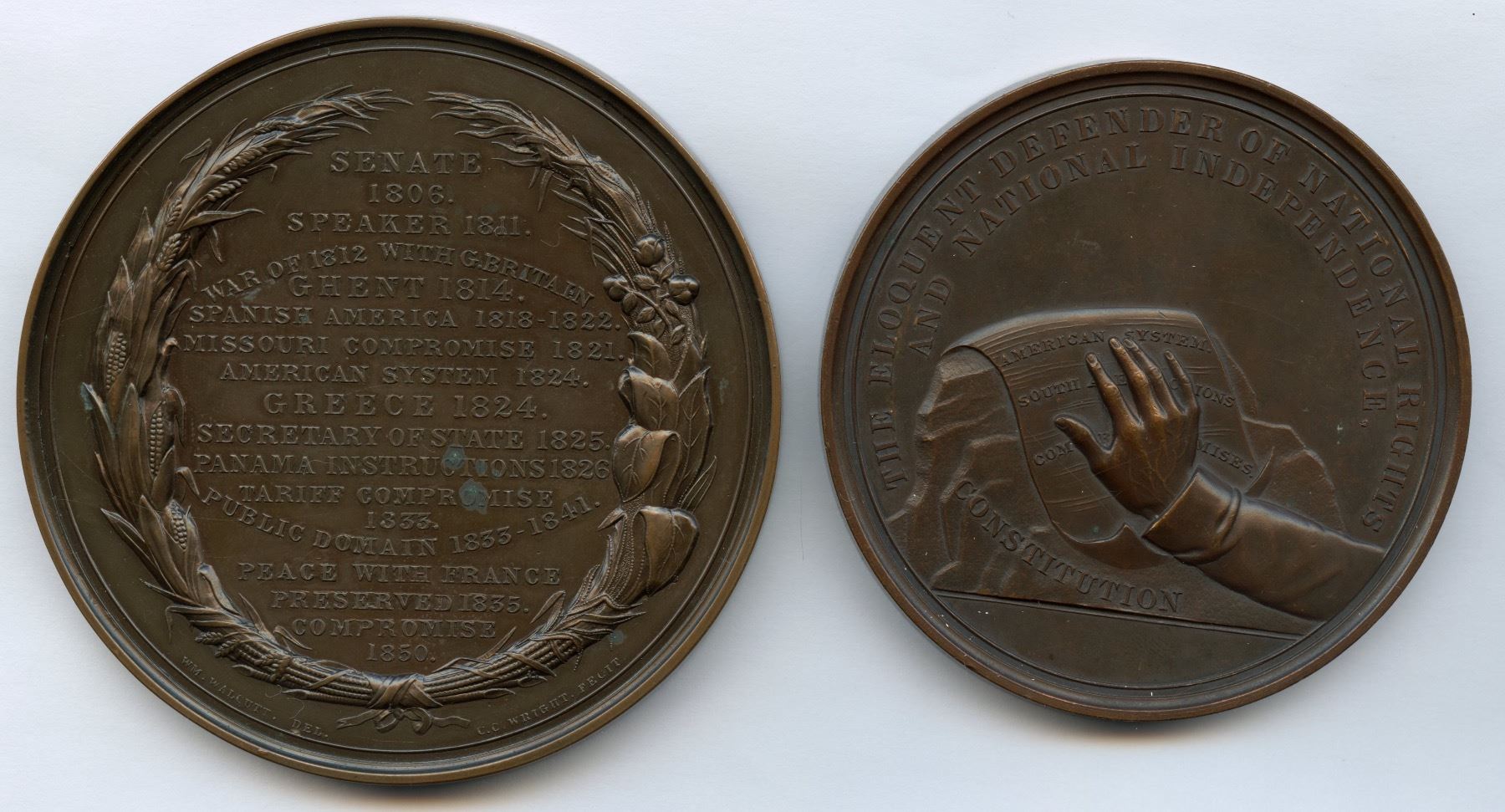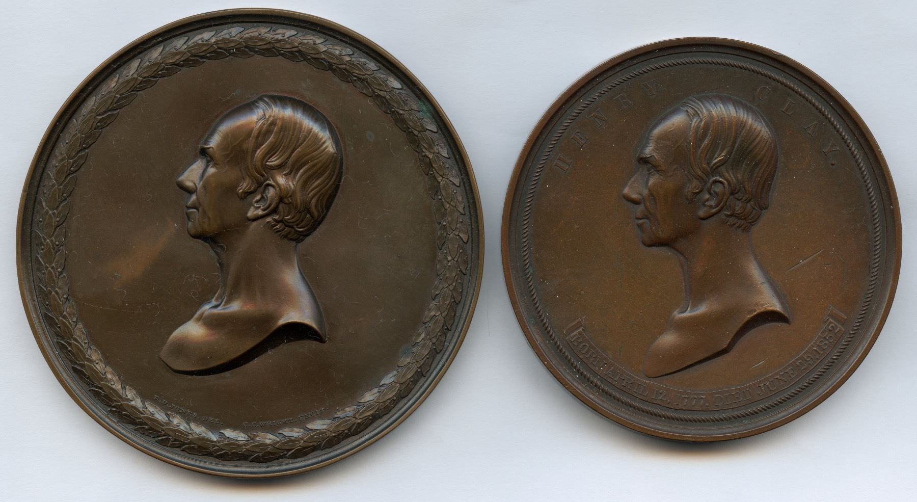 1.) “1850” Memorial medal electrotype, bronze, 89mm. 2.) “1852” Memorial medal, bronze, 76.5mm, Julian PE-8. Superb pair of Henry Clay medals. 2 pcs.