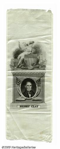 <B>Henry Clay Portrait Ribbon</B></I> One of the most elegant silks issued for a candidate. An 1844 campaign ribbon in support of the great orator Henry Clay. Black on white, 3" x 8" overall, a few light creases that are barely noticeable, cataloged as Sullivan/Fischer HC-9. The slogan surrounding the portrait, "Champion of the American System," very much says it all! A fabulous example of marketing a 19th century statesman. Lot:256