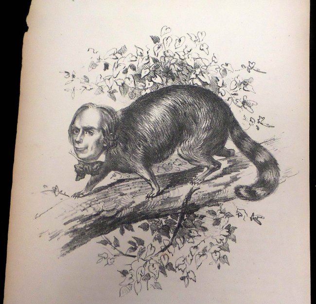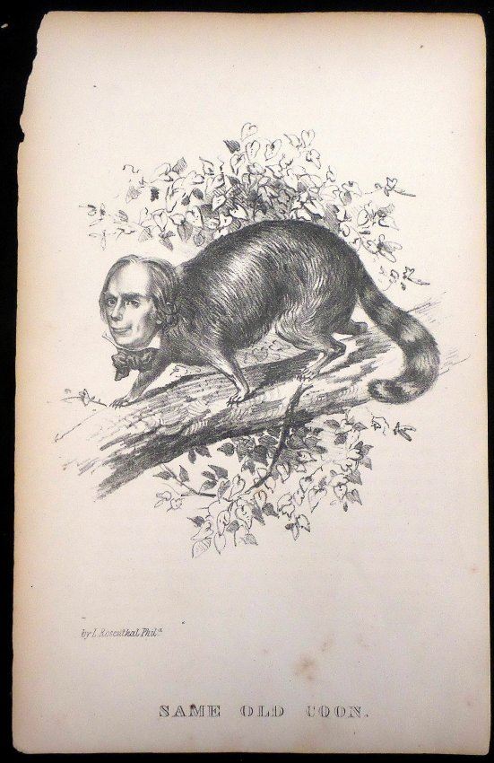 Political cartoon depicting an anthropomorphic raccoon with the head of Henry Clay. Titled beneath image, "SAME OLD COON." Imprinted "By L. Rosenthal, Phila." [10-5/8" H x 6-3/4" W]. Age-toning, stains, and loss at the upper left corner [not affecting central image].