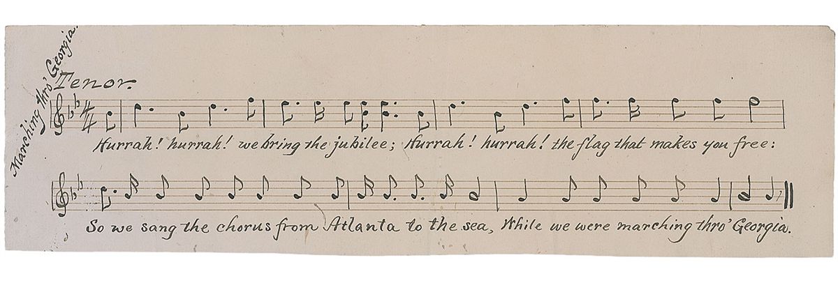 American composer and songwriter (1832–1884) best known for his work produced during the Civil War. Handwritten musical manuscript, unsigned, one page on a 10.5 x 3 sheet of lined music paper, no date. Work pens the music and lyrics to the tenor part of the nine-measure chorus of his famous song, titled “Marching thro' Georgia” in the upper left corner. Work writes, "Hurrah! hurrah! We bring the jubilee; Hurrah! hurrah! the flag that makes you free: So we sang the chorus from Atlanta to the sea, While we were marching thro' Georgia." In fine condition, with a few vertical creases and wrinkles. Inspired by Sherman's March to the Sea, Work wrote ‘Marching Through Georgia’ at the end of the previous year. Thanks to its lively melody, the song was immensely popular, its million sheet-music sales being unprecedented.