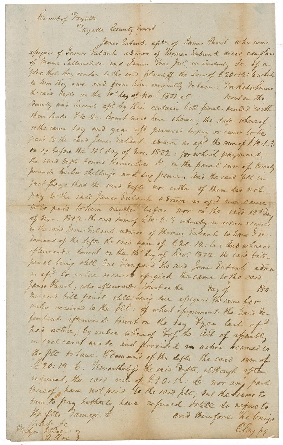 ADS, signed “Clay,” one page, 7.5 x 12, March 1804. A legal document regarding the non-payment of a debt between James Eubank and James Panit. Document has been professionally silked on the reverse. Toning along intersecting folds, one through a single letter of signature, aforementioned silking, a few small holes along fold, and a few edge chips, otherwise very good condition.