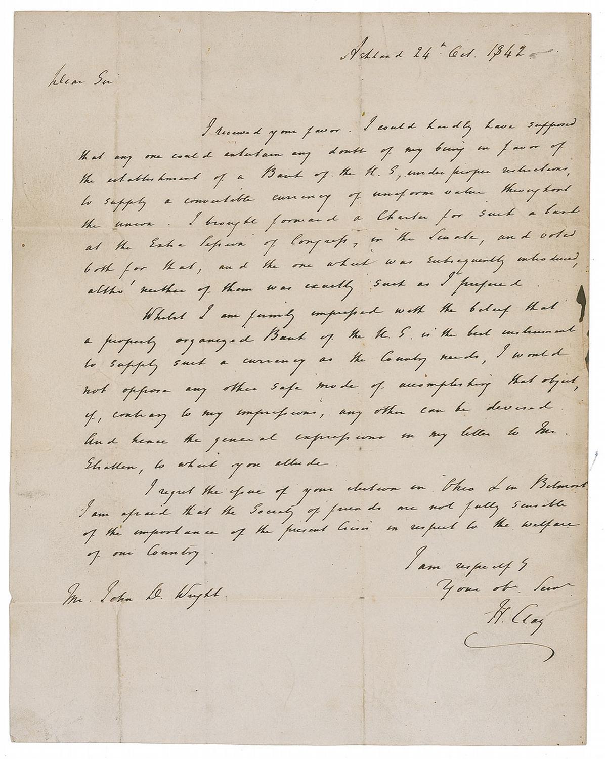 ALS signed “H. Clay,” one page, 8 x 10, October 24, 1842. Letter to John D. Wright. In part: “I could hardly have supposed any one could entertain any doubt of my being in favor of the establishment of a Bank of the US under proper restrictions, to supply a convertible currency of uniform value throughout the union. I brought forward a Charter for such a bank at the Late Session of Congress, in the Senate, and voted both for that, and the one which was subsequently introduced, altho’ neither of them was exactly such as I prepared. While I am firmly impressed with the belief that a properly organized Bank of the US is the best instrument to supply such a currency as the Country needs, I would not oppose any other safe mode of accomplishing that object, if, contrary to my impressions, any other can be devised. And hence the general impressions in my letter to Mr. Shatten, to which you allude. I regret the issue of your election in Ohio & in Belmont. I am afraid that the Society of Friends are not fully suitable of the importance of the present Crisis in respect to the welfare of our Country.”
