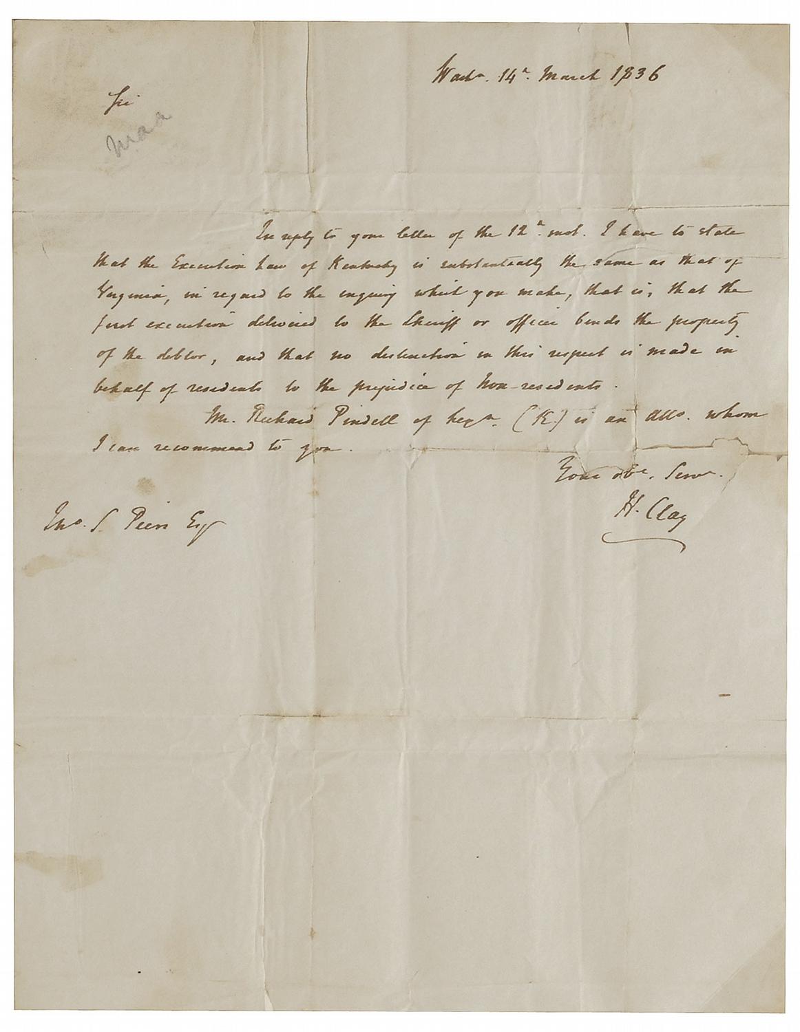 ALS signed “H. Clay,” one page, 7.75 x 10, March 14, 1836. Clay writes John S. Peer. In full: “In reply to your letter of the 12th inst. I have to state that the Execution Law of Kentucky is substantially the same as that of Virginia, in regard to the inquiry which you make, that is; that the first execution delivered to the Sherriff [sic] or officer binds the property of the debtor, and that the distinction in this respect is made in behalf of residents to the predjudice [sic] of non-residents. Mr. Richard Pindell of Lex[ington] (K)[entucky] is an Att[orney] whom I can recommend to you.” Covered in removable clear plastic and matted to an overall size of 20.5 x 15. In very good condition, with creasing, wrinkling, intersecting horizontal and vertical folds with some separation, and scattered toning and soiling. The integral page bears an address panel written by Clay with the upper right corner (once carrying the free frank) removed.