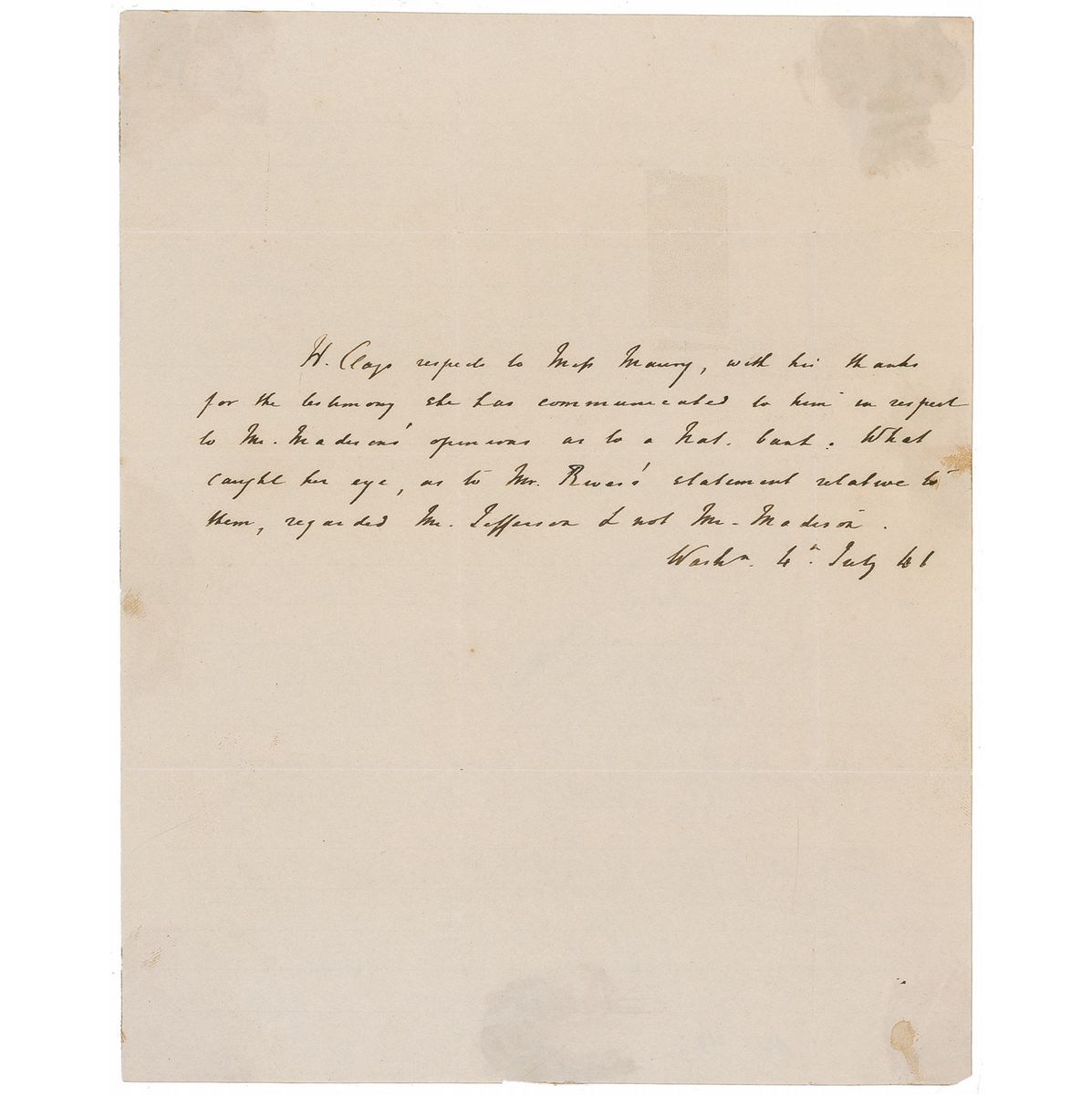 Third-person ALS, one page, 8 x 10, July 4, 1841. Letter reads, in full: “H. Clays respects to Miss Maury, with his thanks for the testimony she has communicated to him in respect to Mr. Madison's opinions as to a Nat. bank. What caught her eye, as to Mr. River's statement relative to them, regarded Mr. Jefferson & not Mr. Madison." Intersecting folds, some light toning and show-through from tape and mounting remnants on reverse, and a few light stains, otherwise fine condition.