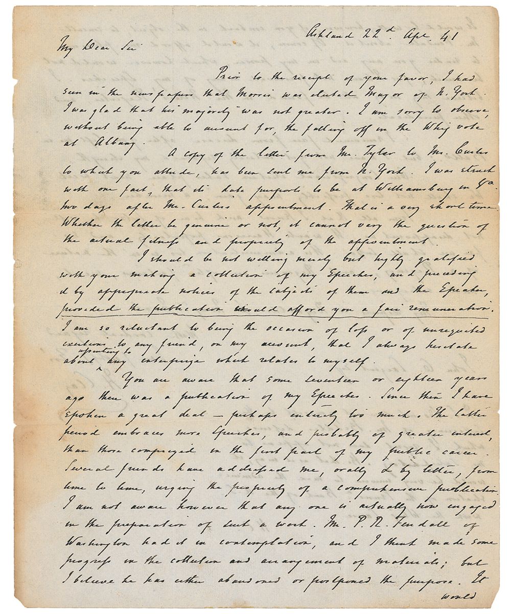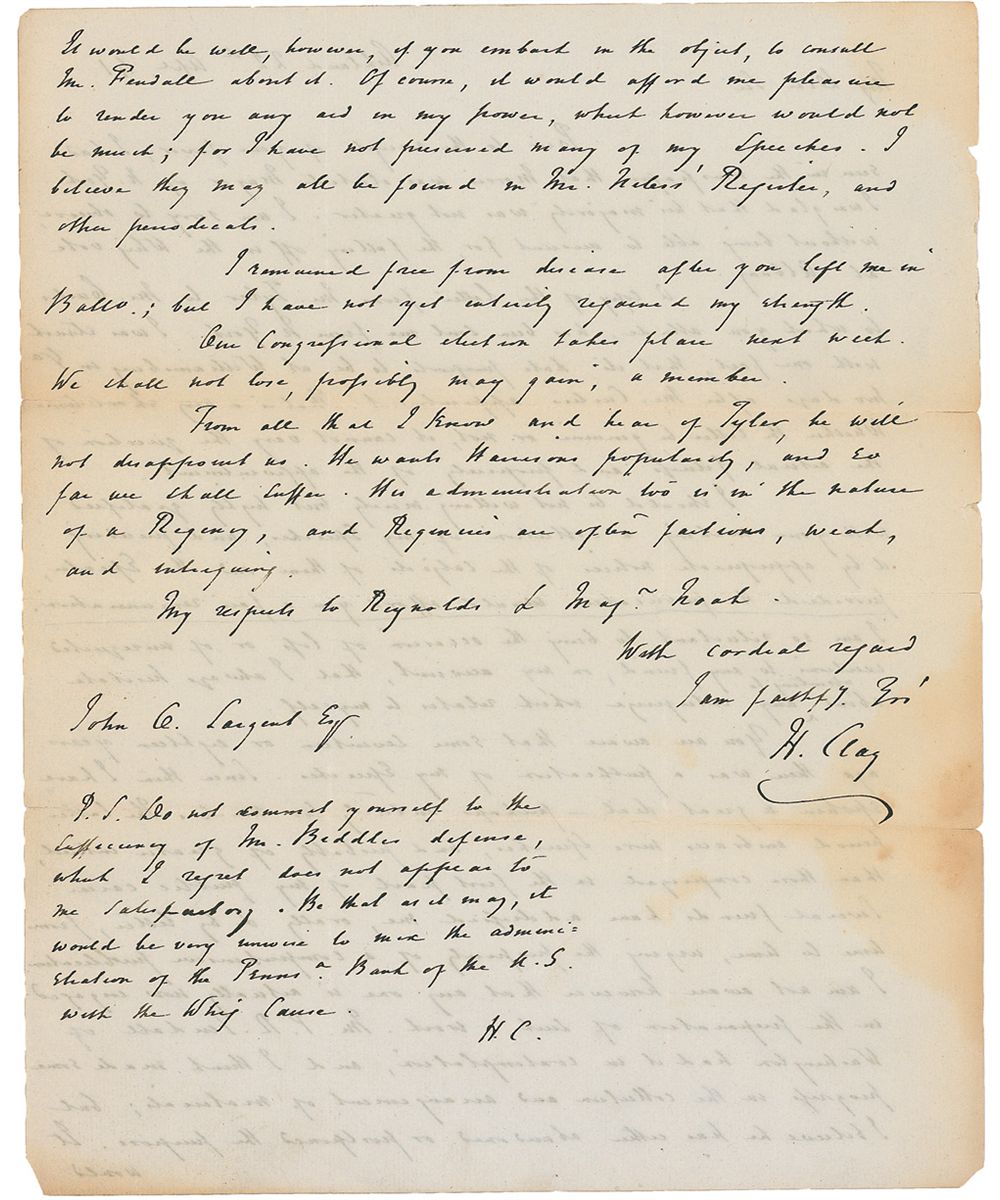 ALS signed “H. Clay,” one page both sides, 8 x 10, April 22, 1841. Letter to John C. Largent, Esq. In part: “Prior to the receipt of your favor, I had seen in the newspapers that Morris was elected Mayor of N. York. I was glad that his majority was not greater. I am sorry to observe without being able to account for, the falling off in the Whig vote at Albany. A copy of the letter from Mr. Tyler to Mr. Curtis to which you allude, has been sent me from N. York. I was struck with one fact, that its date purports to be at Williamsburg in Va. two days after Mr. Curtis’ appointment. That is a very short time. Whether the letter be genuine or not, it cannot vary the question of the actual fullness and propriety of the appointment. I should be not willing merely but highly gratified with your making a collection of my speeches…Our Congressional election takes place next week…From all that I know and hear of Tyler, he will not disappoint us. He wants Harrison’s popularity, and so far we shall suffer. His administration too is in the nature of a Regency, and Regencies’ are often factious, weak, and intriguing.” Clay also adds a postscript, signed “H.C.,” and it reads, in part: “Do not commit yourself to the sufficiency of Mr. Biddle’s defense, which I regret does not appear to be satisfactory, it would be unwise to mine the administration of the…Bank of the U.S. with the Whig Cause.” Partial separations along intersecting folds, scattered toning (heavier along folds and edges), semicircular area of light staining touching the signature, and slight show-through from writing on opposing sides, otherwise very good condition. Clay sent this letter a little over two weeks after the death of William Henry Harrison. At the time, many in the Whig Party believed that the new president, John Tyler, would continue to endorse their policies as he would indicate in his Inaugural Address. Clay, who had failed to secure that party’s backing for the presidency in 1840, wasn’t so sure.