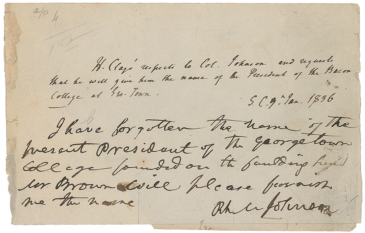 Third-person ANS signed “H. Clay,” one page, 7.75 x 5, January 9, 1836. Clay writes to Col. R. M. Johnson, who would become Van Buren’s vice president in the following year. In full: “H. Clay’s respects to Col. Johnson and requests that he will give him the name of the President of the Bacon College of Geo. Town.” Johnson’s responds at the bottom, writing that he cannot remember his name and signing, “Rh. M. Johnson.” Clay also addressed the letter on the reverse of the second integral page, “The Hon’ble R. M. Johnson.” In very good condition, with two vertical folds with light separation, small dings and tears to the edges, mounting remnants to the left border, a few pencil notations to the upper left, and paper loss and pencil notations to the second integral page.