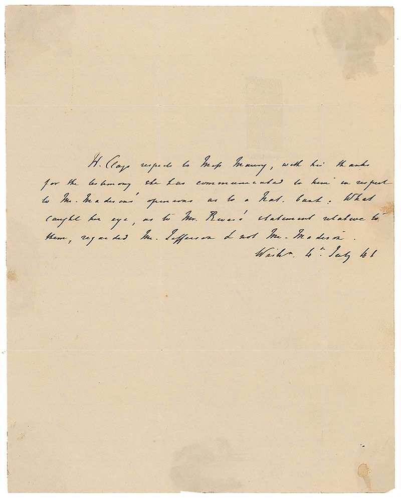 Third-person ALS, signed in the text, “Henry Clay,” one page, 8 x 10, July 4, 1841. Letter reads, in full: “H. Clays respects to Miss Maury, with his thanks for the testimony she has communicated to him in respect to Mr. Madison's opinions as to a Nat. bank. What caught her eye, as to Mr. River's statement relative to them, regarded Mr. Jefferson & not Mr. Madison." Intersecting folds and show-through from tape and mounting remnants on reverse, and a few light stains, otherwise fine condition.