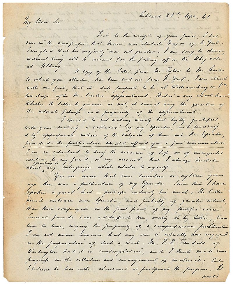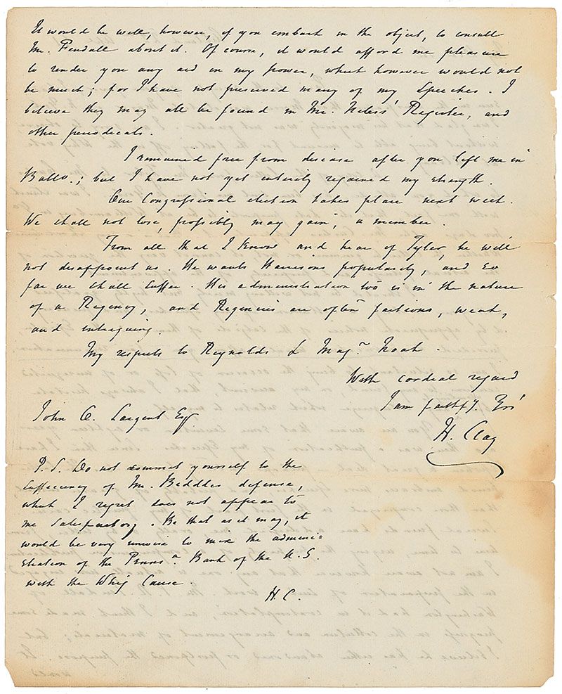 ALS signed “H. Clay,” one page both sides, 8 x 10, April 22, 1841. Letter to John C. Largent, Esq. In part: “I had seen in the newspapers that Morris was elected Mayor of N. York. I was glad that his majority was not greater. I am sorry to observe without being able to account for, the falling off in the Whig vote at Albany. I should be not willing merely but highly gratified with your making a collection of my speeches…Our Congressional election takes place next week…From all that I know and hear of Tyler, he will not disappoint us. He wants Harrison’s popularity, and so far we shall suffer. His administration too is in the nature of a Regency, and Regencies are often factious, weak, and intriguing.” Clay also adds a postscript, signed “H.C.,” and it reads, in part: “Do not commit yourself to the sufficiency of Mr. Biddle’s defense, which I regret does not appear to be satisfactory, it would be unwise to mine the administration of the…Bank of the U.S. with the Whig Cause.” Partial separations along intersecting folds, scattered toning (heavier along folds and edges), semicircular area of light staining touching the signature, and slight show-through from writing on opposing sides, otherwise very good condition. Clay sent this letter a little over two weeks after the death of William Henry Harrison.