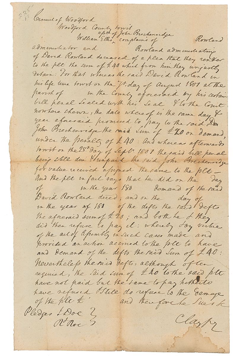 ADS, signed “Clay pr,” one page, 7.75 x 12.5, no date. Legal document suing the estate of David Rowland for non-payment of 40 pounds due to Clay's client, William Ellis, assignee of John Breckenridge. Document concludes, “Nevertheless the said debts, although often required, the said sum of £40 to the said plt have not paid but the same to pay hitherto have refused & still do refuse to the damage of the plt.” In very good condition, with light toning along intersecting folds and dampstaining under signature.