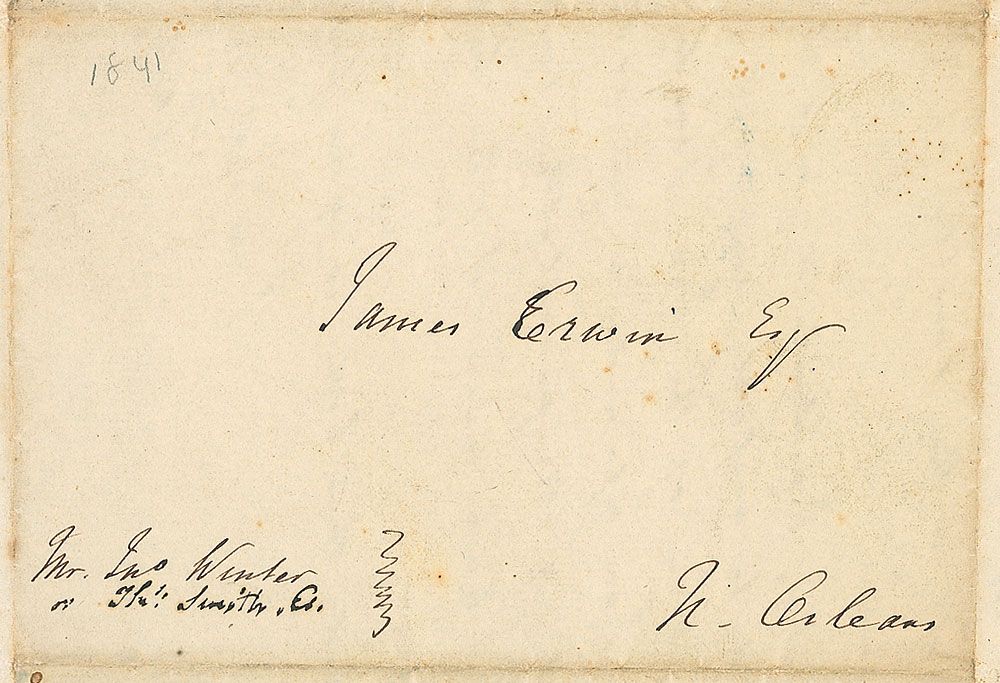 ALS signed “H. Clay,” one page, 8 x 9.75, November 8, 1841. Letter of introduction to James Erwin of New Orleans. In part: “Mr. Winter, I understand, is a…machinist, who could be usefully employed on a sugar plantation, or some of the iron foundries in the city. Mrs. Winter, I am informed, is an accomplished and amiable lady of irreproachable conduct, & well qualified to teach music & other branches of female education.” Address panel to reverse of second integral page is also addressed in Clay’s hand. In fine condition, with intersecting folds (one vertical fold passing through first letter of the signature), and a small area of paper loss to the left edge.