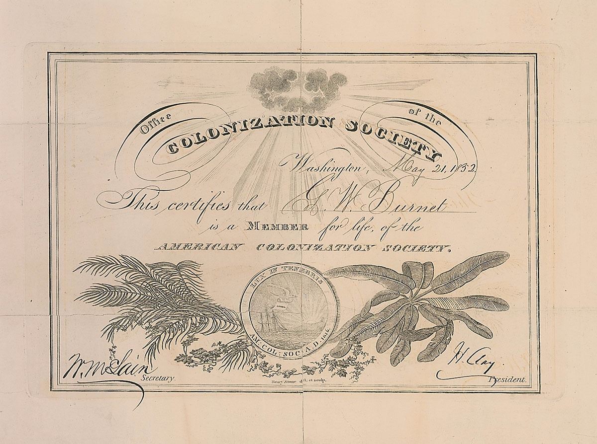 Partly-printed DS, signed “H. Clay,” one page, 11 x 8.25, May 21, 1852. A certificate from the American Colonization Society issued to G. W. Burnett conferring lifetime membership upon him. Boldly signed in the lower right corner by Clay as the society’s president. In very good condition, with a tape-repaired partial separation to left edge.