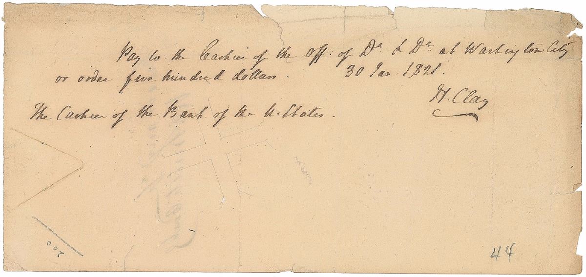 Autograph check, 8 x 3.75, entirely filled out and signed by Clay, “H. Clay,” directed to “The Cashier of the Bank of the U. States,” January 30, 1821. In full: “Pay to the Cashier of the Off. of Dr. & Dr. at Washington City or order five hundred dollars.” In very good to fine condition, with edge tears and chips