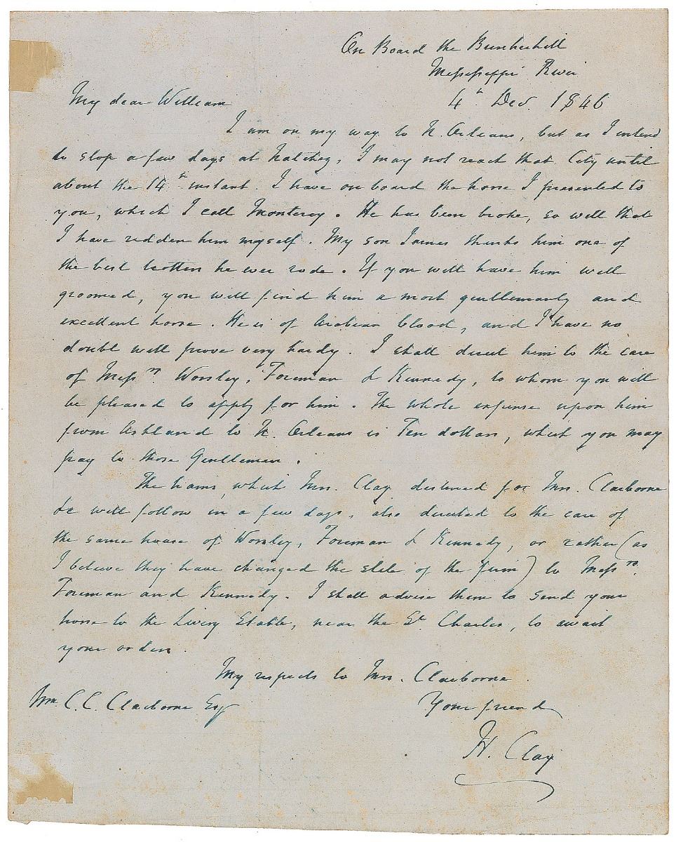 ALS signed “H. Clay,” one page, 8 x 10, December 4, 1846. Letter to William C. C. Claiborne, in part: “I am on my way to N. Orleans, but as I intend to stop a few days at Natchez, I may not reach that City until about the 14th instant. I have on board the horse I presented to you, which I call Monterey. He has been broke, so well that I have ridden him myself. My son James thinks him one of the best trotters he ever rode. If you will have him well groomed, you will find him a most gentlemanly and excellent horse. He is of Arabian blood, and I have no doubt will prove very hardy. I shall direct him to the care of Messrs. Worsley, Foreman & Kennedy, to whom you will be pleased to apply for him. The whole expense upon him from Ashland to N. Orleans is Ten dollars, which you may pay to those gentlemen.” Addressed on the reverse of the second integral page in Clay’s own hand. In very good to fine condition, with scattered light stains and two old tape remnants on the left edge.