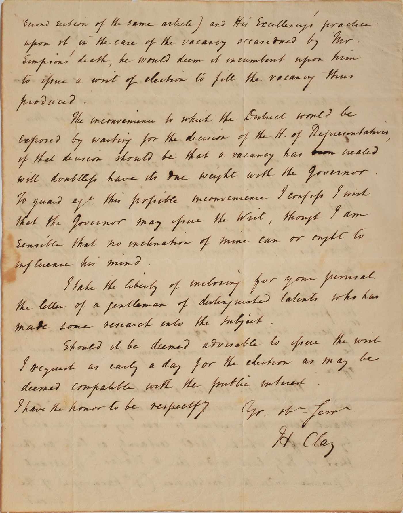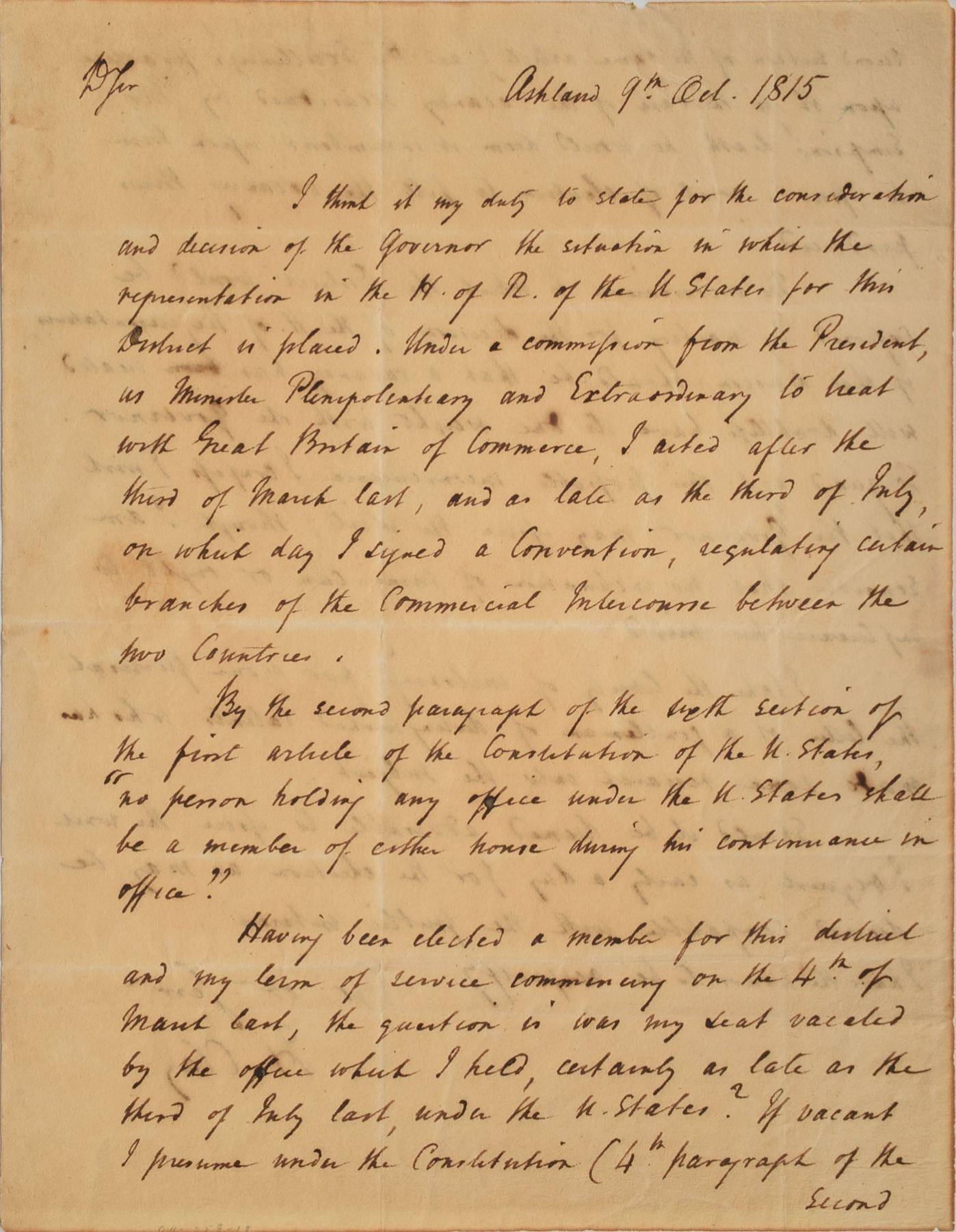 Interesting ALS signed “H. Clay,” one page both sides, 7.75 x 9.75, October 9, 1815. Letter to M. D. Hardin, in part: "I think it is my duty to state for the consideration and decision of the Governor the situation in which the representation in the H. of R. of the U. States for this District is placed. Under a commission from the President, as Minister Plenipotentiary and Extraordinary to treat with Great Britain of Commerce, I acted after the third of March last, and as last as the third of July, on which day I signed a Convention, regulating certain branches of the Commercial Intercourse between the two Countries. By the second paragraph of the sixth section of the first article of the Constitution of the U. States, 'no person holding any office under the U. States shall be a member of either house during his continuance in office.' Having been elected a member for this district and my term of service commencing on the 4th of March last, the question is was my seat vacated by the office which I held, certainly as late as the third of July last, under the U. States?…I take the liberty of inclosing for your perusal the letter of a gentleman of distinguished talents who has made some research into the subject." In very good to fine condition, with light toning and staining. Accompanied by the detached address panel, with the center panel addressed in Clay's own hand. Clay's tenure as a Kentucky congressman was interrupted from 1814 to 1815, when he traveled to Europe to sign a commercial convention as minister plenipotentiary to Great Britain. His worries concerning his vacated former seat were allayed not long after having written this letter; on October 30, 1815, Clay filled his own vacancy when he was elected in a special election as a Democratic Republican to the Fourteenth Congress. A fascinating bit of Clay history.