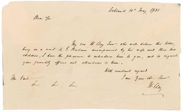 ALS signed “H. Clay,” one page, 8 x 4.75, May 10, 1835. Letter of introduction to the U. S. Charge D’Affaires to Great Britain Aaron Vail. In part: “My son H. Clay Junr, who will deliver this letter, being on a visit to G. Britain accompanied by his wife…I have the pleasure to introduce him to you, and to request your friendly offices and attentions to him.” In very good condition, with intersecting folds, one through a single letter of signature, trimmed edges, scattered soiling, and mounting remnants on reverse. Pre-certified PSA/DNA and RRAuction COA.
