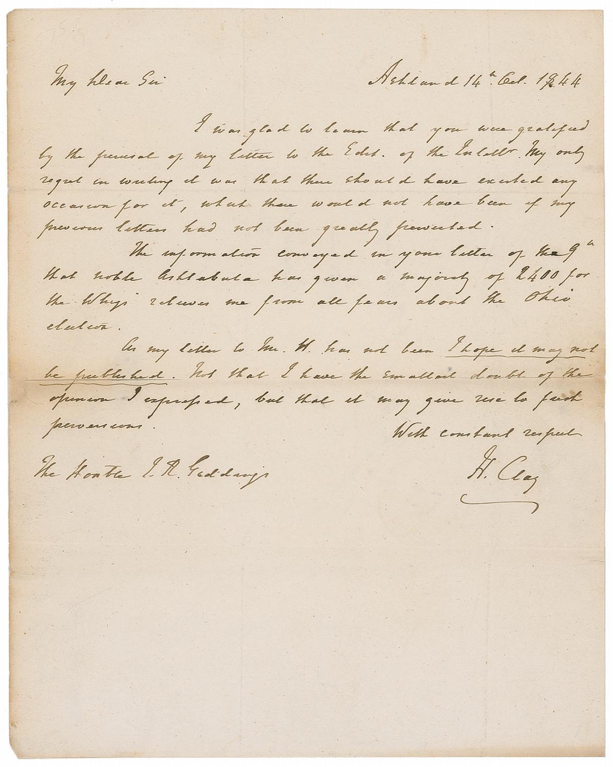 Distinguished statesman, US senator, secretary of state, speaker of the house, and three-time presidential candidate (1777–1852) who became known as the ‘Great Compromiser’ for his support of the Union prior to the Civil War. ALS signed “H. Clay,” one page, 8 x 10, October 14, 1844. Letter to fellow Whig Joshua Giddings. In full: “I am glad to learn that you were gratified by the perusal of my letter to the Edit. Of the Intell’r. My only regret in writing it was that there should have existed any occasion for it, which there would not have been if my previous letters had not been greatly perverted. The information conveyed in your letter of the 9th that noble Ashtabula [County] has given a majority of 2400 for the Whigs relieves me from all fears about the Ohio election. As my letter to Mr. H. has not been I hope it may not be published. Not that I have the smallest doubt of the opinion I expressed, but that it may give rise to fresh perversions.” Second integral page bears an address panel in Clay’s hand, as well as red wax seal remnants and two docketing notations. In very good to fine condition, with intersecting folds, one through a single letter of signature, scattered toning, small repair to left edge, and a bit of light soiling. Writing this letter in the weeks leading up to the 1844 presidential contest, Clay was locked in a battle against Democratic Party challenger James K. Polk and Liberty Party candidate James G. Birney. When all of the votes had been tallied, Clay was easily outvoted in the Electoral College, but the popular vote was extremely close between Clay and Polk. As he predicted here, Ohioan voters gave Clay a 6,000-vote victory over Polk. Historians maintain that Clay—who opposed admitting Texas as a state for fear it would reawaken the slavery issue and provoke Mexico to declare war—had many potential votes siphoned by the Birney’s anti-slavery campaign.